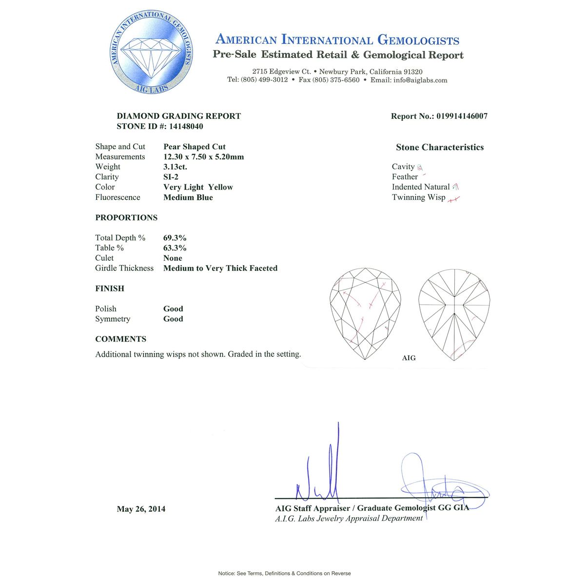 One electronically tested 14KT white gold ladies cast diamond ring with a bright polish finish. Condition is new, good workmanship. The featured diamond is set within a two tiered diamond bezel supported by tapering shoulders, completed by a three millimeter wide band. Identified with markings of "K14". Containing: One prong set pear shaped cut diamond, measuring 12.30 x 7.50 x 5.20mm (depth est.), 10.00.%. GTCF approximate weight of 3.13ct with a medium blue fluorescence. Faint secondary color throughout. Diamond Grading Report attached. Graded in the setting. Clarity: SI-2. Depth: 69.3%. Table 63.3%. Twenty-Nine prong set round brilliant cut diamonds, measuring 2.60 - 2.20 x 1.44mm (depth est.) approximate. Total Weight of 29 Stones = 1.56ct. Graded in the setting. Clarity: SI-1 to I-1. Color: I - K. Total Weight of Diamonds 4.69ct. Total Weight of Ring 6.29 grams. AIG Appraised at $47,040.00.