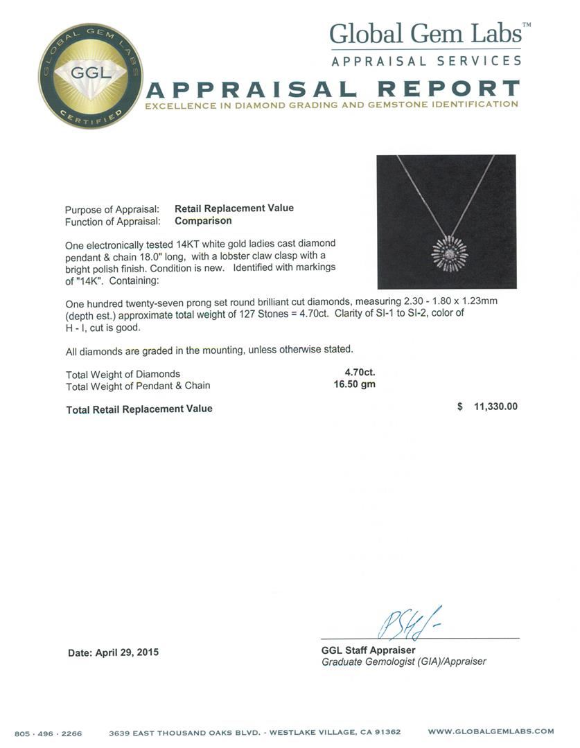 One electronically tested 14KT white gold ladies cast diamond pendant & chain 18.0" long, with a lobster claw clasp with a bright polish finish. Identified with markings of "14K". Condition is new. Containing: One Hundred Twenty-Seven prong set round brilliant cut diamonds, measuring 2.30 - 1.80 x 1.23mm (depth est.) approximate total weight of 127 Stones = 4.70ct. Clarity: SI-1 to SI-2. Color: H - I, Cut is Good. All diamonds are graded in the mounting, unless otherwise stated. Total Weight of Diamonds 4.70ct. Total Weight of Pendant & Chain 16.50 grams. GGL Appraised at $11,330.00.
