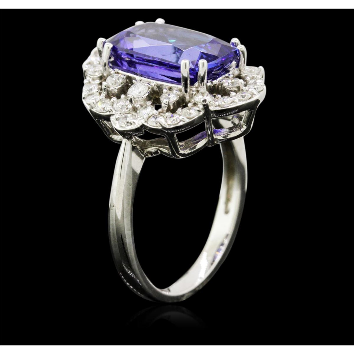 One electronically tested 14KT white gold ladies cast tanzanite and diamond ring with a bright polish finish. Identified with markings of "14K". Condition is new. Containing: One prong set rectangular cushion modified brilliant cut natural tanzanite, measuring 12.28 x 7.83 x 6.22mm, approximate weight of 4.71ct., clarity is eye clean, type I, medium, moderately strong, violet color, (GIA V 5/4), cut is good. Thirty-Seven prong set round brilliant cut diamonds, measuring 1.60 - 1.60 x 0.96mm (depth est.) approximate total weight of 37 Stones = 0.55ct. Clarity: I-1. Color: H - I, Cut is Good. Colored gemstones are presumed to have been subjected to commonly used enhancement processes. All diamonds and colored gemstones are graded in the mounting, unless otherwise stated. Total Weight of Colored Stones 4.71ct. Total Weight of Diamonds 0.55ct. Total Weight of Ring 6.40 grams. GGL Appraised at $5,130.00.