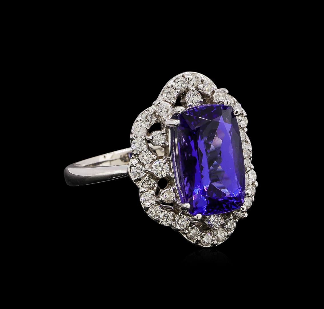 One electronically tested 14KT white gold ladies cast tanzanite and diamond ring with a bright polish finish. Identified with markings of "14K". Condition is new. Containing: One prong set rectangular cushion modified brilliant cut natural tanzanite, measuring 12.28 x 7.83 x 6.22mm, approximate weight of 4.71ct., clarity is eye clean, type I, medium, moderately strong, violet color, (GIA V 5/4), cut is good. Thirty-Seven prong set round brilliant cut diamonds, measuring 1.60 - 1.60 x 0.96mm (depth est.) approximate total weight of 37 Stones = 0.55ct. Clarity: I-1. Color: H - I, Cut is Good. Colored gemstones are presumed to have been subjected to commonly used enhancement processes. All diamonds and colored gemstones are graded in the mounting, unless otherwise stated. Total Weight of Colored Stones 4.71ct. Total Weight of Diamonds 0.55ct. Total Weight of Ring 6.40 grams. GGL Appraised at $5,130.00.