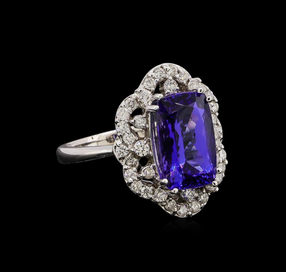 One electronically tested 14KT white gold ladies cast tanzanite and diamond ring with a bright polish finish. Identified with markings of "14K". Condition is new. Containing: One prong set rectangular cushion modified brilliant cut natural tanzanite, measuring 12.28 x 7.83 x 6.22mm, approximate weight of 4.71ct., clarity is eye clean, type I, medium, moderately strong, violet color, (GIA V 5/4), cut is good. Thirty-Seven prong set round brilliant cut diamonds, measuring 1.60 - 1.60 x 0.96mm (depth est.) approximate total weight of 37 Stones = 0.55ct. Clarity: I-1. Color: H - I, Cut is Good. Colored gemstones are presumed to have been subjected to commonly used enhancement processes. All diamonds and colored gemstones are graded in the mounting, unless otherwise stated. Total Weight of Colored Stones 4.71ct. Total Weight of Diamonds 0.55ct. Total Weight of Ring 6.40 grams. GGL Appraised.