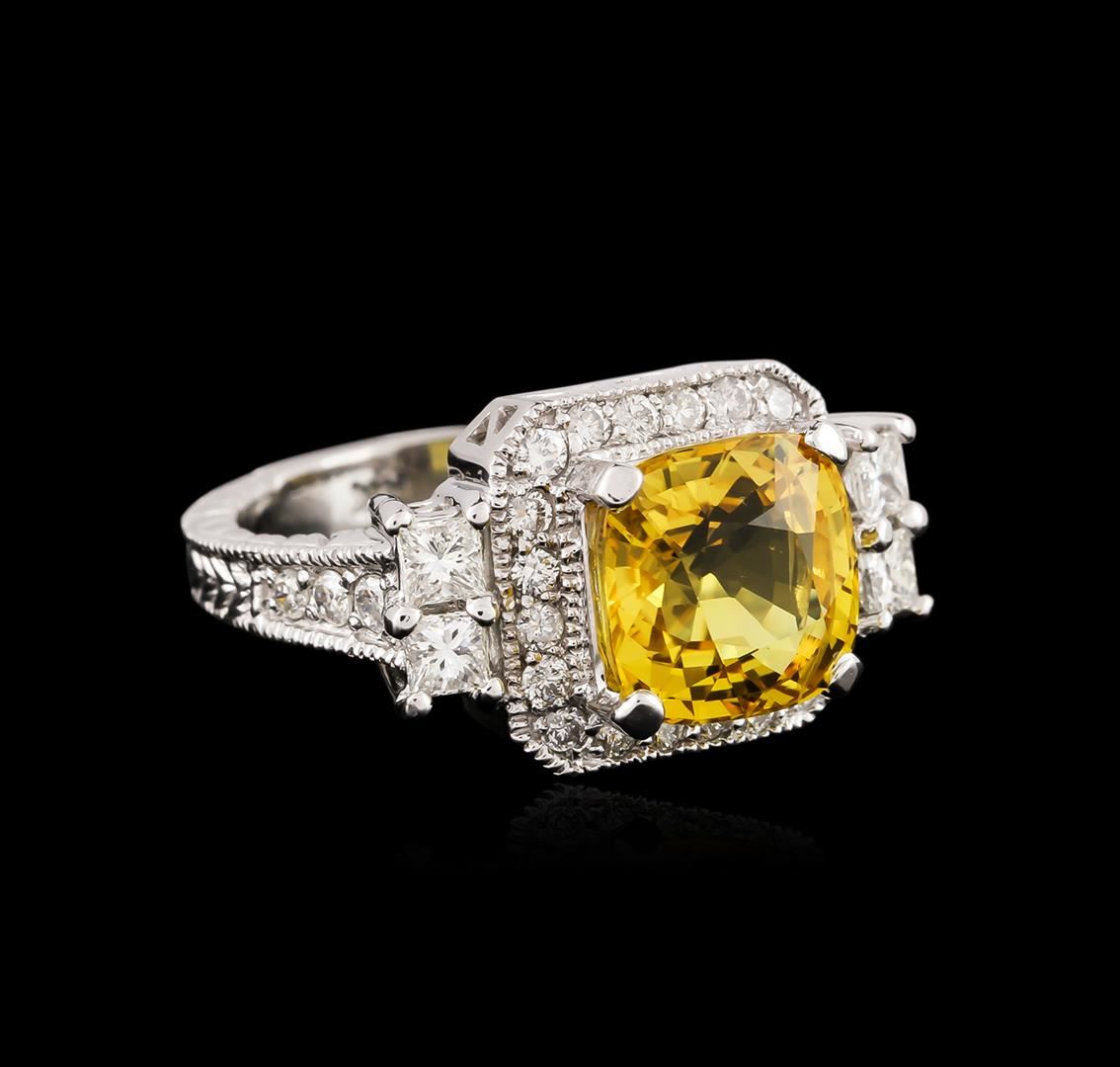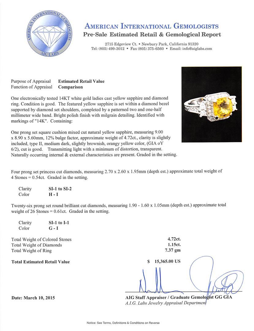 One electronically tested 14KT white gold ladies cast yellow sapphire and diamond ring. The featured yellow sapphire is set within a diamond bezel supported by diamond set shoulders, completed by a patterned two and one-half millimeter wide band. Bright polish finish with milgrain detailing. Identified with markings of "14K". Condition is good. Containing: One prong set square cushion mixed cut natural yellow sapphire, measuring 9.00 x 8.90 x 5.60mm, 12% bulge factor, approximate weight of 4.72ct., clarity is slightly included, type II, medium dark, slightly brownish, orangy yellow color, (GIA oY 6/2), cut is good. Transmitting light with a minimum of distortion, transparent. Naturally occurring internal & external characteristics are present. Graded in the setting. Four prong set princess cut diamonds, measuring 2.70 x 2.60 x 1.95mm (depth est.) approximate total weight of 4 Stones = 0.54ct. Graded in the setting. Clarity: SI-1 to SI-2. Color: H - I Twenty-Six prong set round brilliant cut diamonds, measuring 1.90 - 1.60 x 1.05mm (depth est.) approximate total weight of 26 Stones = 0.61ct. Graded in the setting. Clarity: SI-1 to I-1. Color: G - I. Total Weight of Colored Stones 4.72ct. Total Weight of Diamonds 1.15ct. Total Weight of Ring 7.37 grams. AIG Appraised at $15,365.00.