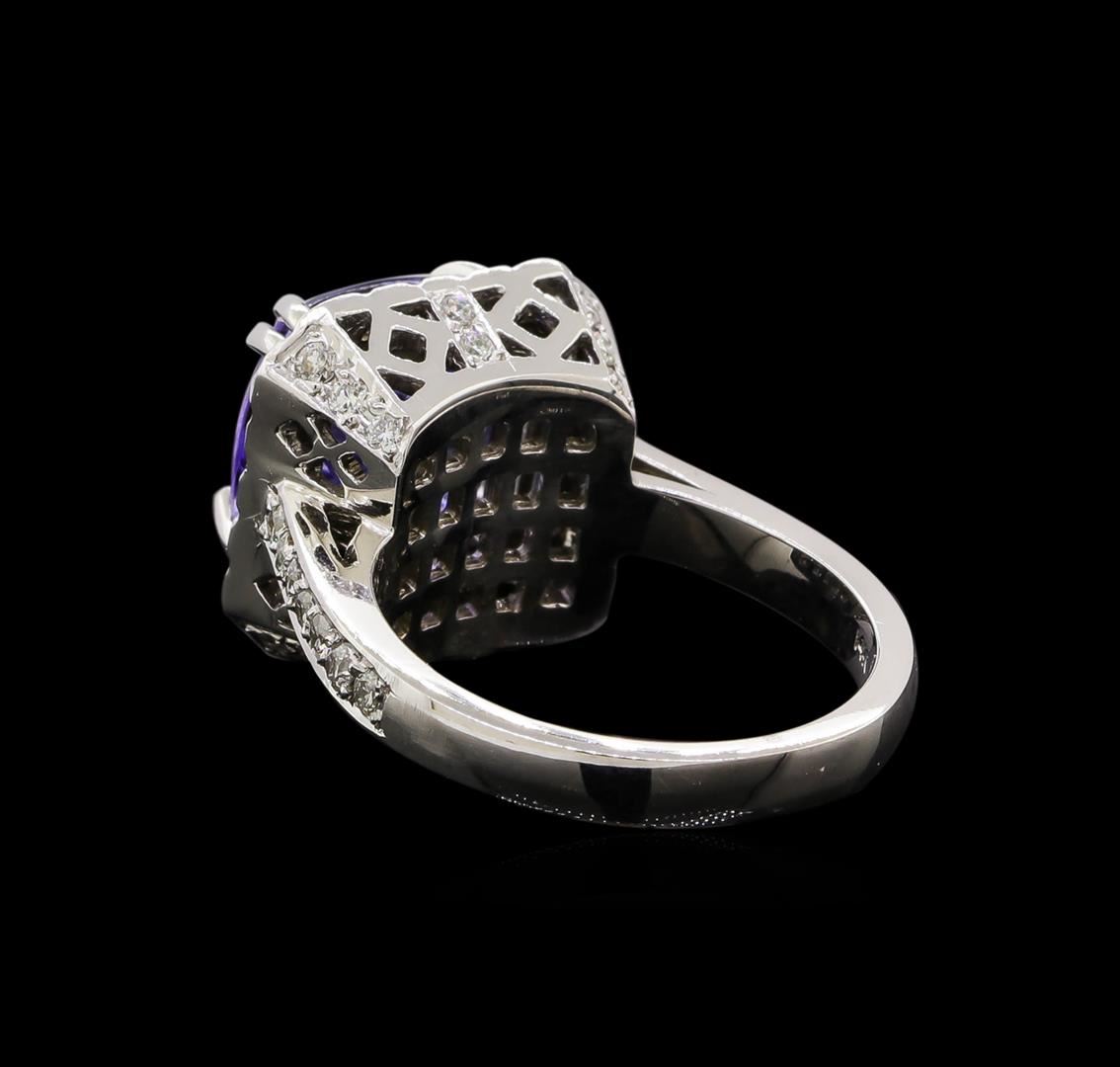 One electronically tested 14KT white gold ladies cast tanzanite and diamond ring with a bright polish finish. Identified with markings of "14K". Condition is new. Containing: One prong set square cushion modified brilliant cut natural tanzanite, measuring 9.70 x 9.78 x 6.33mm, approximate weight of 4.73ct., clarity is eye clean, type I, medium light, very slightly grayish, violet color, (GIA V 4/3), cut is good. Fifty-Two prong set round brilliant cut diamonds, measuring 1.50 - 1.20 x 0.81mm (depth est.) approximate total weight of 52 Stones = 0.47ct. Clarity: SI-2 to I-1. Color: I - J, Cut is Good. Colored gemstones are presumed to have been subjected to commonly used enhancement processes. All diamonds and colored gemstones are graded in the mounting, unless otherwise stated. Total Weight of Colored Stones 4.73ct. Total Weight of Diamonds 0.47ct. Total Weight of Ring 7.60 grams. GGL Appraised at $4,970.00.