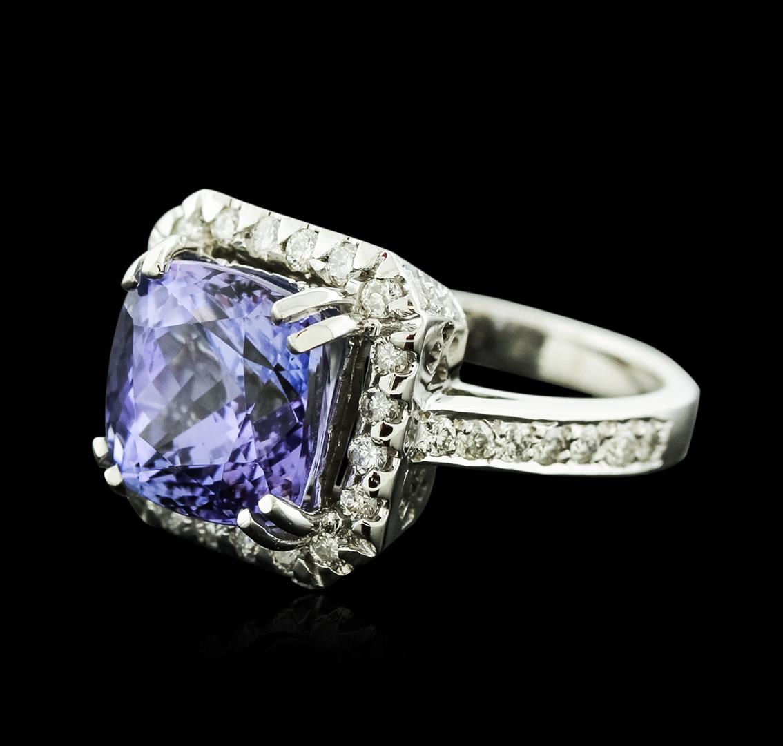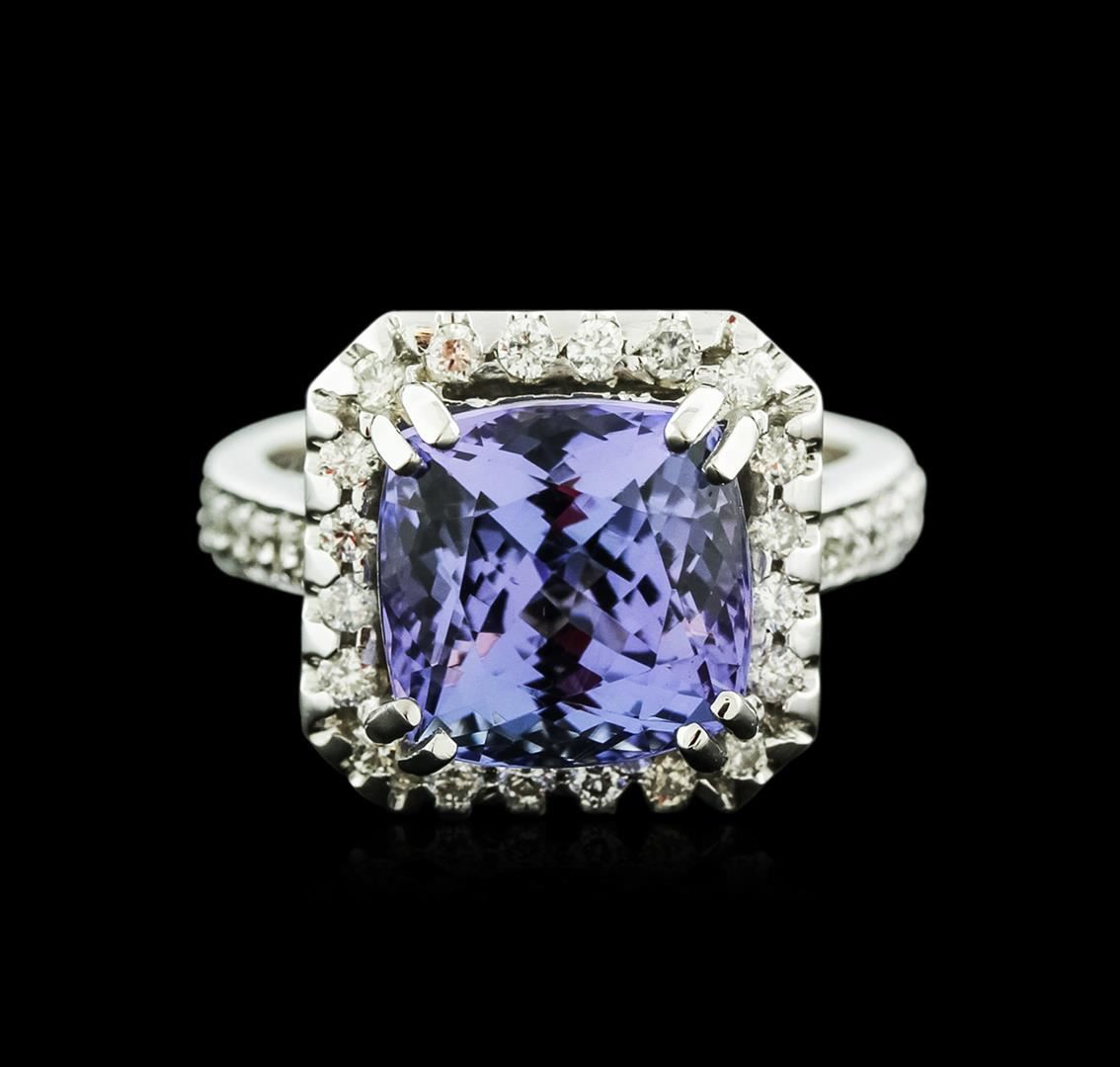 One electronically tested 14KT white gold ladies cast tanzanite and diamond ring with a bright polish finish. Identified with markings of "14K". Condition is new. Containing: One prong set square cushion modified brilliant cut natural tanzanite, measuring 9.70 x 9.78 x 6.33mm, approximate weight of 4.73ct., clarity is eye clean, type I, medium light, very slightly grayish, violet color, (GIA V 4/3), cut is good. Fifty-Two prong set round brilliant cut diamonds, measuring 1.50 - 1.20 x 0.81mm (depth est.) approximate total weight of 52 Stones = 0.47ct. Clarity: SI-2 to I-1. Color: I - J, Cut is Good. Colored gemstones are presumed to have been subjected to commonly used enhancement processes. All diamonds and colored gemstones are graded in the mounting, unless otherwise stated. Total Weight of Colored Stones 4.73ct. Total Weight of Diamonds 0.47ct. Total Weight of Ring 7.60 grams. GGL Appraised at $4,970.00.