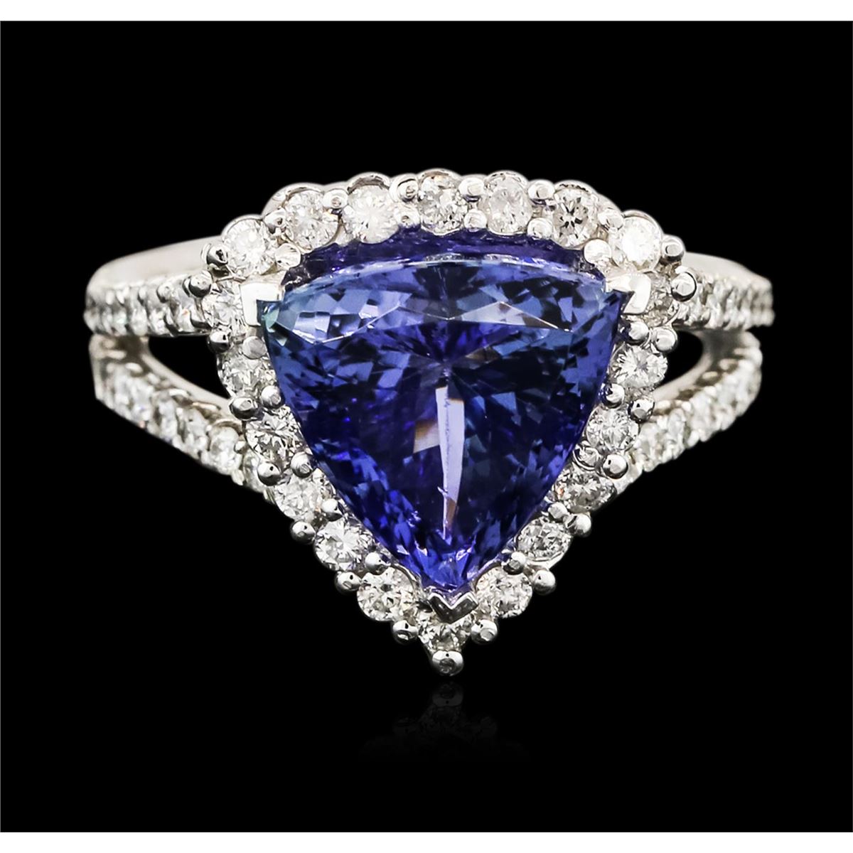 One electronically tested 14KT white gold ladies cast tanzanite and diamond ring with a bright polish finish. Identified with markings of "14K". Condition is new. Containing: One prong set triangle modified brilliant cut natural tanzanite, measuring 11.00 x 11.00 x 6.50mm, approximate weight of 4.74ct., clarity is eye clean, type I, medium light, very slightly grayish, bluish violet color, (GIA bV 4/3), cut is good. Seventy-Four prong set round brilliant cut diamonds, measuring 1.50 - 1.50 x 0.90mm (depth est.) approximate total weight of 74 Stones = 0.91ct. Clarity: SI-2 to I-1. Color: H - I, Cut is Good. Colored gemstones are presumed to have been subjected to commonly used enhancement processes. All diamonds and colored gemstones are graded in the mounting, unless otherwise stated. Total Weight of Colored Stones 4.74ct. Total Weight of Diamonds 0.91ct. Total Weight of Ring 6.20 grams. GGL Appraised at $5,780.00.