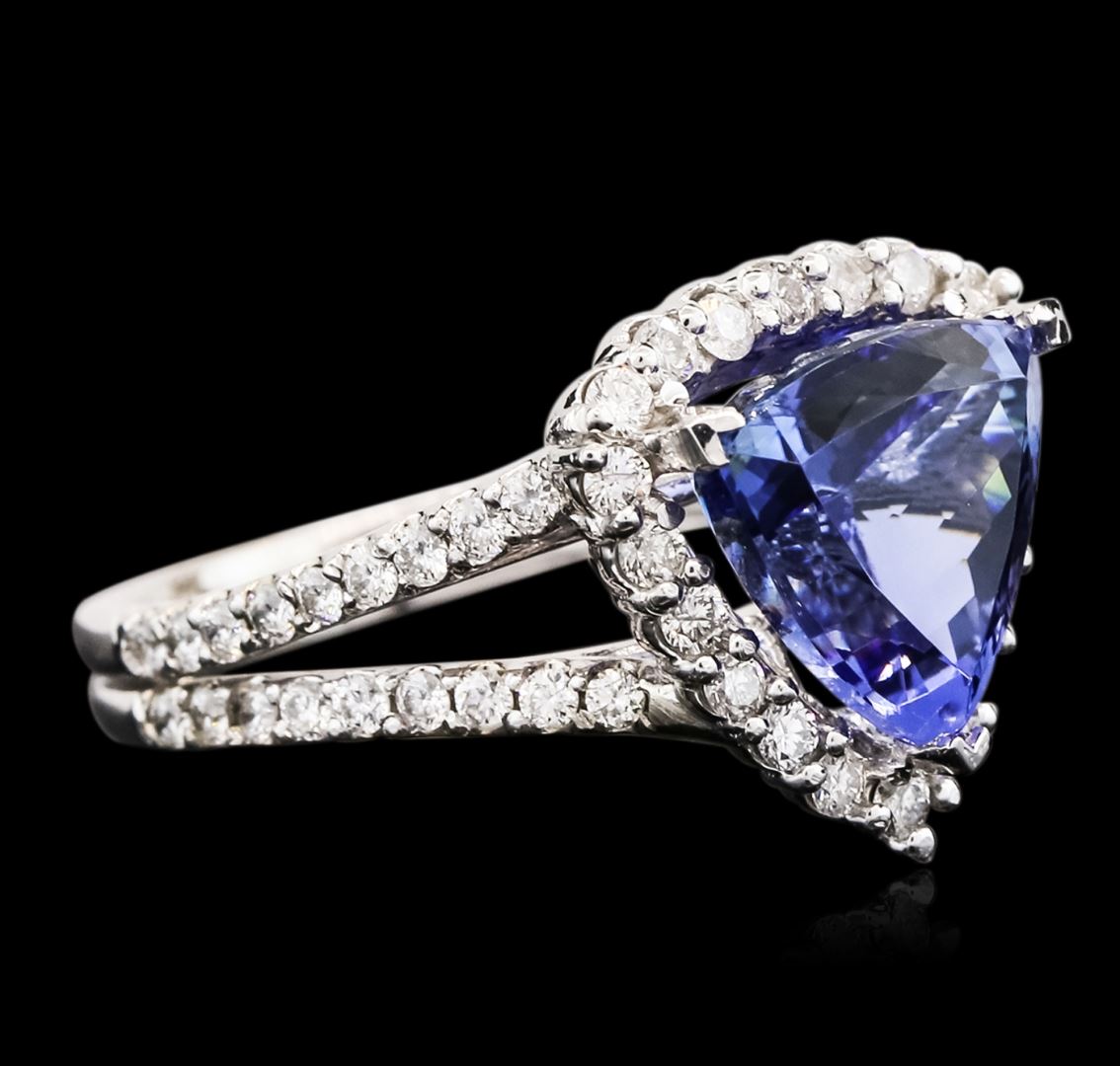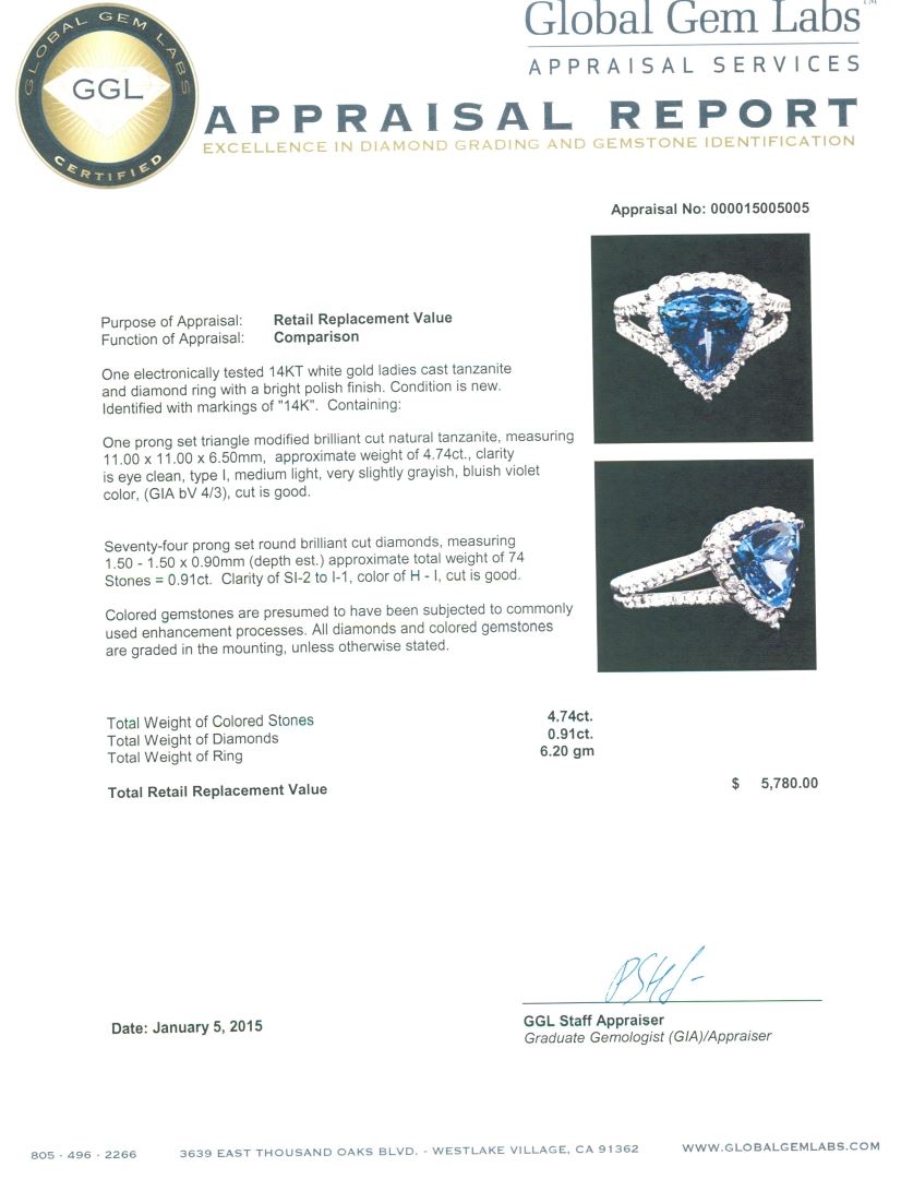 One electronically tested 14KT white gold ladies cast tanzanite and diamond ring with a bright polish finish. Identified with markings of "14K". Condition is new. Containing: One prong set triangle modified brilliant cut natural tanzanite, measuring 11.00 x 11.00 x 6.50mm, approximate weight of 4.74ct., clarity is eye clean, type I, medium light, very slightly grayish, bluish violet color, (GIA bV 4/3), cut is good. Seventy-Four prong set round brilliant cut diamonds, measuring 1.50 - 1.50 x 0.90mm (depth est.) approximate total weight of 74 Stones = 0.91ct. Clarity: SI-2 to I-1. Color: H - I, Cut is Good. Colored gemstones are presumed to have been subjected to commonly used enhancement processes. All diamonds and colored gemstones are graded in the mounting, unless otherwise stated. Total Weight of Colored Stones 4.74ct. Total Weight of Diamonds 0.91ct. Total Weight of Ring 6.20 grams. GGL Appraised at $5,780.00.
