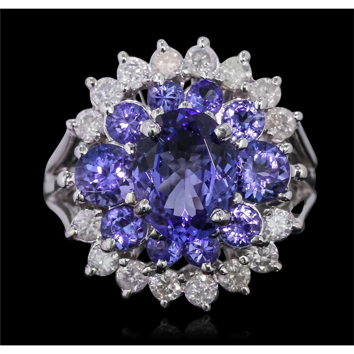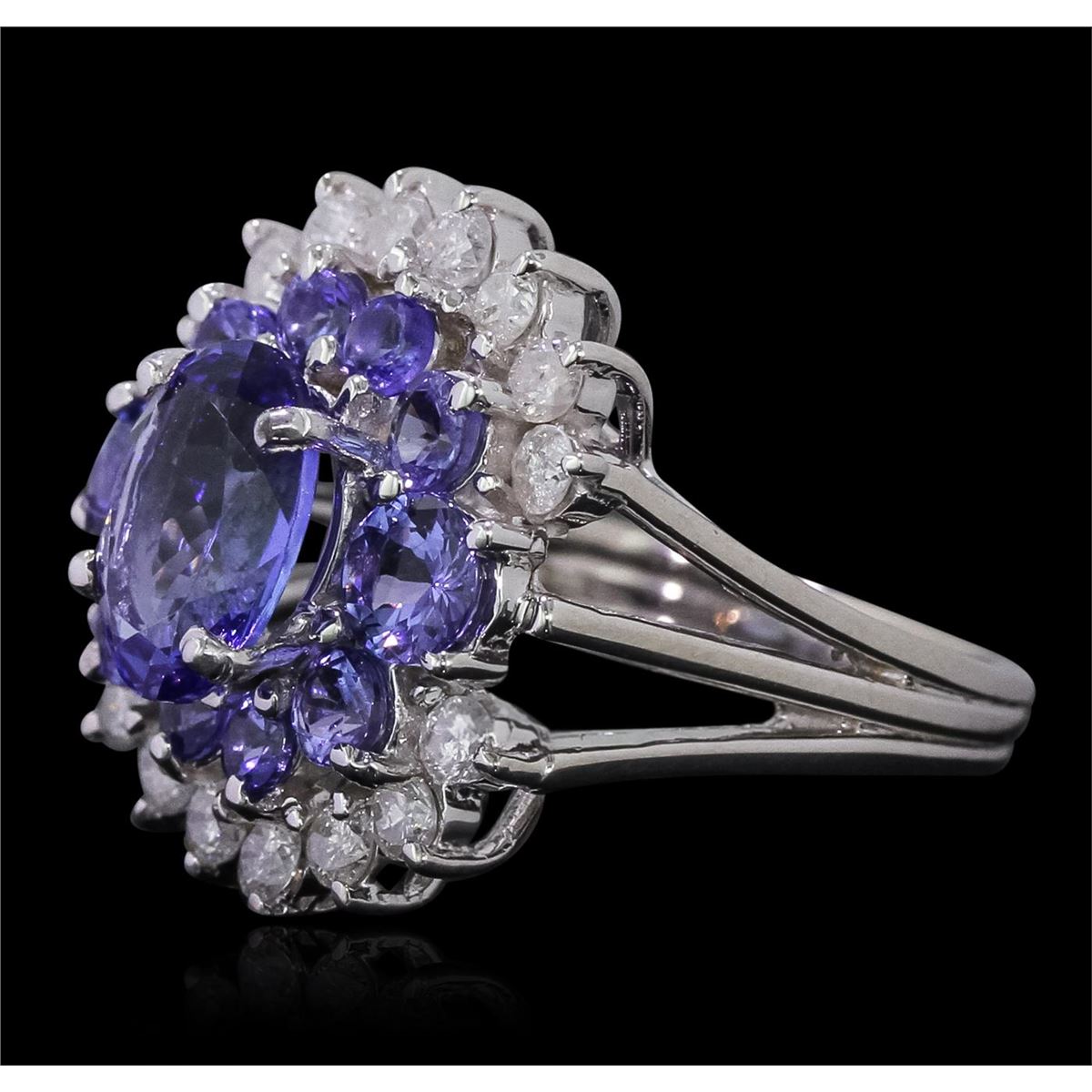 One electronically tested 14KT white gold Ladies combination cast & assembled ring with a bright polish finish. Condition is new. Identified with markings of "14K". Containing: One prong set oval modified brilliant cut natural tanzanite, measuring 9.30 x 7.30 x 3.98mm, approximate weight of 1.84ct., clarity is eye clean, type I, medium light, very slightly grayish, violet color, (GIA V 4/3), cut is good. Sixteen prong set round brilliant cut diamonds, measuring 2.30 - 2.30 x 1.38mm (depth est.) approximate. Total Weight of 16 Stones = 0.71ct. Clarity: I-1 to I-2. Color: I - J, Cut is Good. Ten prong set round modified brilliant cut natural tanzanites, measuring 4.30 - 3.00 x 2.37 mm, approximate. Total Weight of 2.90ct., clarity is eye clean, type I, medium, moderately strong, violet color, (GIA V 5/4), cut is very good. Colored gemstones are presumed to have been subjected to commonly used color/clarity enhancement processes. Total Weight of Colored Stones 4.74ct. Total Weight of Diamonds 0.71ct. Total Weight of Ring 7.70 grams. GGL Appraised at $10,715.00.