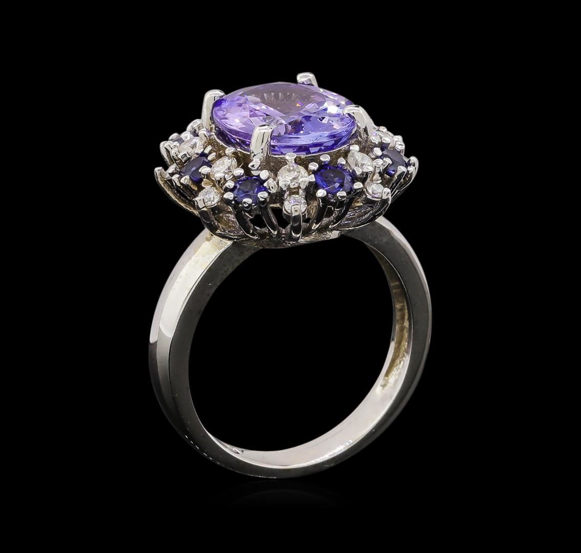 One electronically tested 14KT white gold ladies cast tanzanite, sapphire and diamond ring with a bright polish finish. Identified with markings of "K14". Condition is new. Containing: One prong set oval modified brilliant cut natural tanzanite, measuring 11.50 x 9.50 x 6.18mm, approximate weight of 4.75ct., clarity is eye clean, type I, medium light, very slightly grayish, violet color, (GIA V 4/3), cut is good. Eight prong set round modified brilliant cut natural blue sapphires, measuring 2.60 - 2.60 x 1.69 mm, approximate total weight of 0.72ct., clarity is slightly included, type II, medium, moderately strong, blue color, (GIA B 5/4), cut is good. Sixteen prong set round brilliant cut diamonds, measuring 1.90 - 1.50 x 1.02mm (depth est.) approximate total weight of 16 Stones = 0.29ct. Clarity: SI-1 to I-1. Color: I - J, Cut is Good. Colored gemstones are presumed to have been subjected to commonly used enhancement processes. All diamonds and colored gemstones are graded in the mounting, unless otherwise stated. Total Weight of Colored Stones 5.47ct. Total Weight of Diamonds 0.29ct. Total Weight of Ring 7.70 grams. GGL Appraised at $4,925.00.