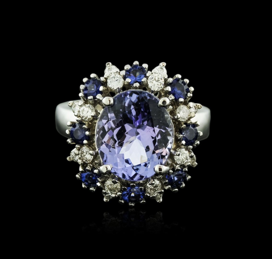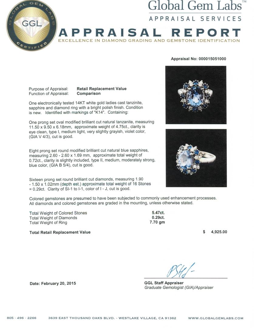 One electronically tested 14KT white gold ladies cast tanzanite, sapphire and diamond ring with a bright polish finish. Identified with markings of "K14". Condition is new. Containing: One prong set oval modified brilliant cut natural tanzanite, measuring 11.50 x 9.50 x 6.18mm, approximate weight of 4.75ct., clarity is eye clean, type I, medium light, very slightly grayish, violet color, (GIA V 4/3), cut is good. Eight prong set round modified brilliant cut natural blue sapphires, measuring 2.60 - 2.60 x 1.69 mm, approximate total weight of 0.72ct., clarity is slightly included, type II, medium, moderately strong, blue color, (GIA B 5/4), cut is good. Sixteen prong set round brilliant cut diamonds, measuring 1.90 - 1.50 x 1.02mm (depth est.) approximate total weight of 16 Stones = 0.29ct. Clarity: SI-1 to I-1. Color: I - J, Cut is Good. Colored gemstones are presumed to have been subjected to commonly used enhancement processes. All diamonds and colored gemstones are graded in the mounting, unless otherwise stated. Total Weight of Colored Stones 5.47ct. Total Weight of Diamonds 0.29ct. Total Weight of Ring 7.70 grams. GGL Appraised at $4,925.00.