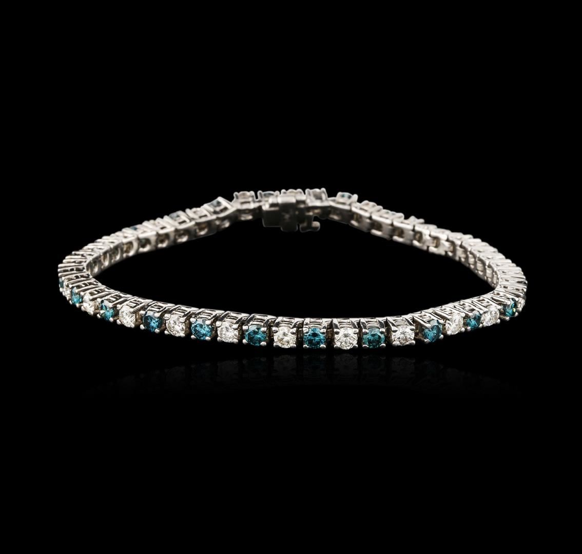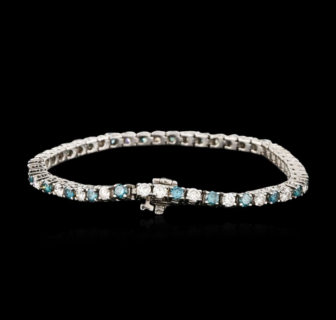 One electronically tested 14KT white gold ladies cast & assembled diamond tennis bracelet with a bright polish finish. Seven inch length bracelet composed of a flexible ribbon of blue and white diamonds, terminating in a concealed clasp with safety bar. Identified with markings of "14K". Condition good. Tennis bracelets & necklaces got their unusual name from an incident involving the U.S. professional tennis player Chris Evert during a tennis match in the 1980's. Evert had been wearing an expensive diamond bracelet, an inline string of individually-set diamonds. Previously these bracelets were known as eternity bracelets. When the clasp snapped during play, she asked the officials to stop the tennis match until the bracelet could be found. Since that day, bracelets and necklaces featuring an inline string of diamonds have been called tennis bracelets and tennis necklaces. Containing: Twenty-Four prong set round brilliant cut diamonds, measuring 3.00 - 2.90 x 1.75mm (depth est.) approximate total weight of 24 Stones = 2.33ct. Color grade is an average for the group. Indications of laboratory irradiated enhanced color. Graded in the setting. Clarity: VS-1 to SI-1 Twenty-Five prong set round brilliant cut diamonds, measuring 3.00 - 2.90 x 1.77mm (depth est.) approximate total weight of 25 Stones = 2.45ct. Graded in the setting. Clarity: SI-1 to SI-2. Color: H - J. Total Weight of Diamonds 4.78ct. Total Weight of Tennis Bracelet 13.25 grams. AIG Appraised at $14,810.00.