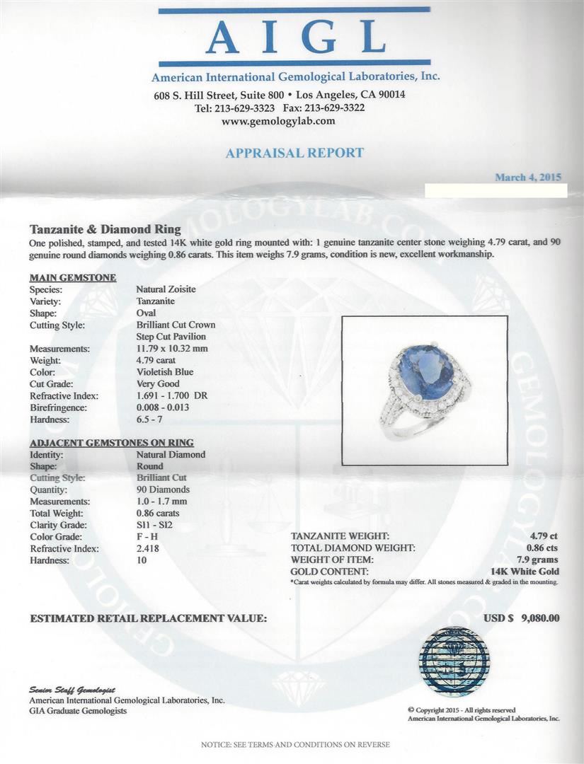 One polished, stamped, and tested 14K white gold ring mounted with: 1 genuine tanzanite center stone weighing 4.79 carat, and 90 genuine round diamonds weighing 0.86 carats. This item weighs 7.9 grams, condition is new, excellent workmanship. MAIN GEMSTONE: Species: Natural Zoisite. Variety: Tanzanite. Shape: Oval. Cutting Style: Brilliant Cut Crown Step Cut Pavilion. Measurements: 11.79 x 10.32 mm. Weight: 4.79 carat. Color: Violetish Blue. Cut Grade: Very Good. Refractive Index: 1.691 - 1.700 DR. Birefringence: 0.008 - 0.013. Hardness: 6.5 - 7. ADJACENT GEMSTONES ON RING: Identity: Natural Diamond. Shape: Round. Cutting Style: Brilliant Cut. Quantity: 90 Diamonds. Measurements: 1.0 - 1.7 mm. Total Weight: 0.86 carats. Clarity Grade: SI1 - SI2. Color Grade: F - H. Refractive Index: 2.418. Hardness: 10. Tanzanite Weight: 4.79 ct. Total Diamond Weight: 0.86 cts. Weight of Item: 7.9 grams. Gold Content: 14K White Gold. AIGL Appraised at $9,080.00.
