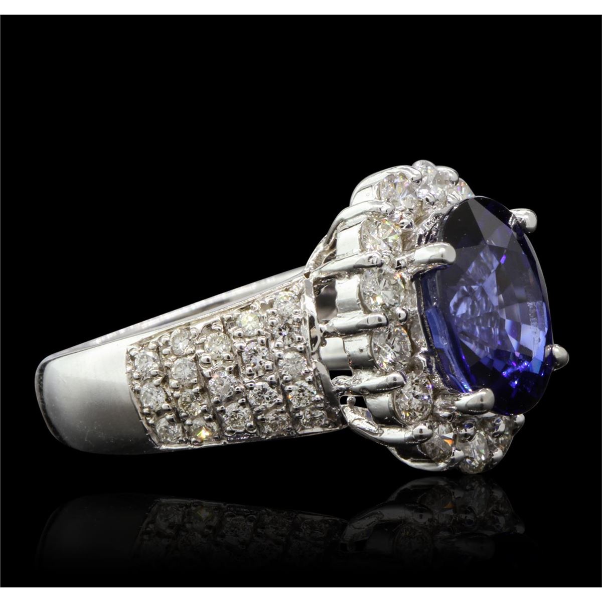 One electronically tested 14KT White Gold ladies cast sapphire and diamond ring with a bright polish finish. Condition is new, good workmanship. The featured sapphire is set within a diamond bezel supported by tapering diamond set shoulders, completed by a three and one-half millimeter wide band. Identified with markings of "K14". Containing: One prong set oval mixed cut natural blue sapphire, measuring 10.08 x 8.90 x 6.05mm, 10%. bulge factor, approximate weight of 4.79ct., clarity is eye clean, type II, dark, moderately strong, blue color, (GIA B 7/4), cut is good. Transmitting light with no distortion, transparent. Indications of laboratory high temperature diffusion treatment. Graded in the setting. Fourteen prong set round brilliant cut diamonds, measuring 2.60 - 2.50 x 1.53mm (depth est.) approximate. Total Weight of 14 Stones = 0.95ct. Graded in the setting. Clarity: SI-2 to I-1. Color: H - J Thirty-Eight bead set round brilliant cut diamonds, measuring 1.30 - 1.20 x 0.75mm (depth est.) approximate. Total Weight of 38 Stones = 0.37ct. Graded in the setting. Clarity: SI-1 to I-1. Color: H - J. Total Weight of Colored Stones 4.79ct. Total Weight of Diamonds 1.32ct. Total Weight of Ring 8.52 grams. AIG Appraised at $6,985.00.