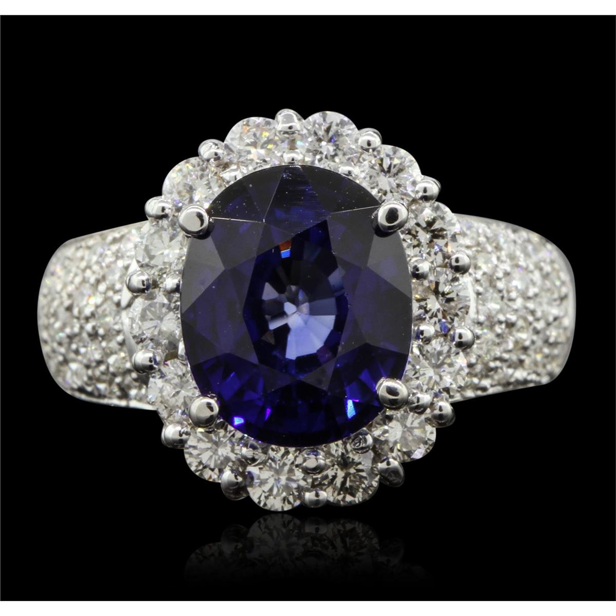 One electronically tested 14KT White Gold ladies cast sapphire and diamond ring with a bright polish finish. Condition is new, good workmanship. The featured sapphire is set within a diamond bezel supported by tapering diamond set shoulders, completed by a three and one-half millimeter wide band. Identified with markings of "K14". Containing: One prong set oval mixed cut natural blue sapphire, measuring 10.08 x 8.90 x 6.05mm, 10%. bulge factor, approximate weight of 4.79ct., clarity is eye clean, type II, dark, moderately strong, blue color, (GIA B 7/4), cut is good. Transmitting light with no distortion, transparent. Indications of laboratory high temperature diffusion treatment. Graded in the setting. Fourteen prong set round brilliant cut diamonds, measuring 2.60 - 2.50 x 1.53mm (depth est.) approximate. Total Weight of 14 Stones = 0.95ct. Graded in the setting. Clarity: SI-2 to I-1. Color: H - J Thirty-Eight bead set round brilliant cut diamonds, measuring 1.30 - 1.20 x 0.75mm (depth est.) approximate. Total Weight of 38 Stones = 0.37ct. Graded in the setting. Clarity: SI-1 to I-1. Color: H - J. Total Weight of Colored Stones 4.79ct. Total Weight of Diamonds 1.32ct. Total Weight of Ring 8.52 grams. AIG Appraised at $6,985.00.