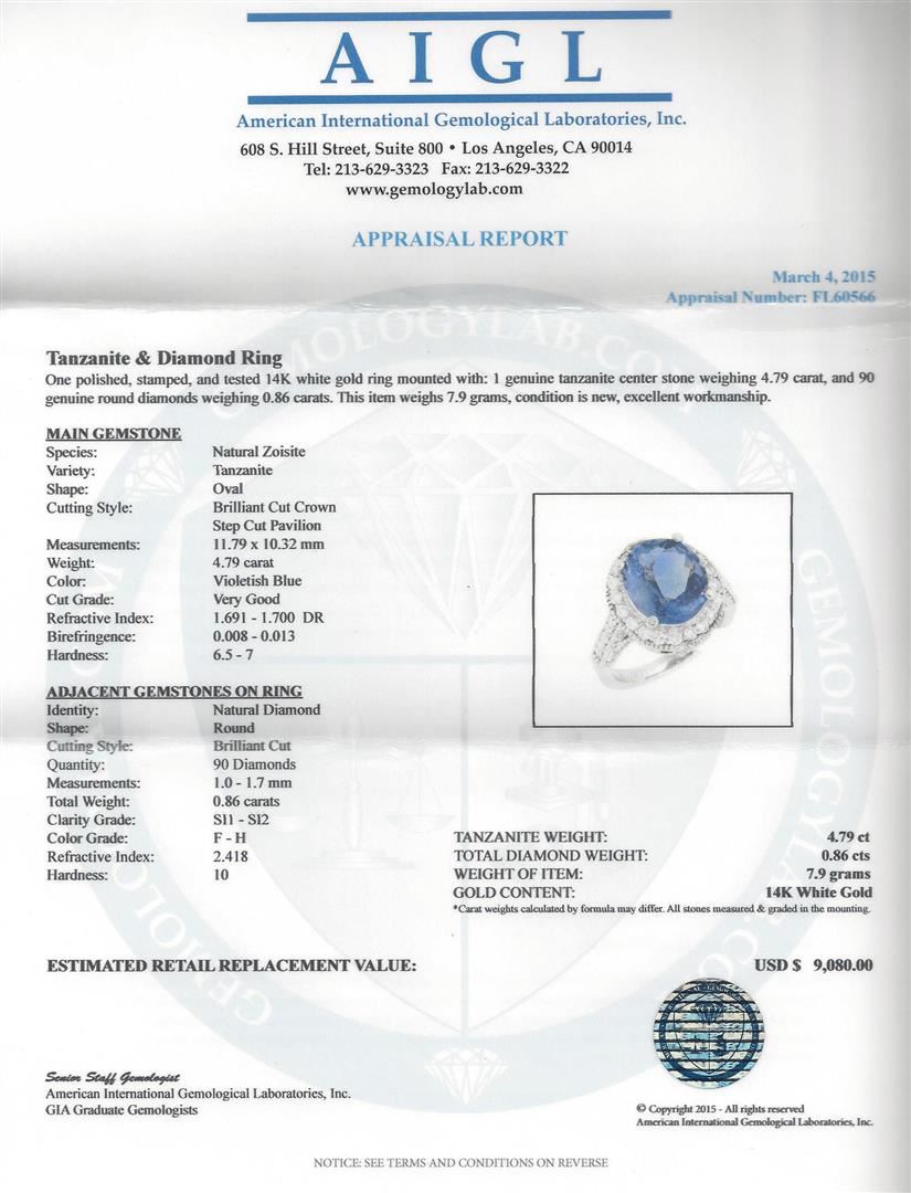 One polished, stamped, and tested 14K white gold ring mounted with: 1 genuine tanzanite center stone weighing 4.79 carat, and 90 genuine round diamonds weighing 0.86 carats. This item weighs 7.9 grams, condition is new, excellent workmanship. MAIN GEMSTONE: Species: Natural Zoisite. Variety: Tanzanite. Shape: Oval. Cutting Style: Brilliant Cut Crown Step Cut Pavilion. Measurements: 11.79 x 10.32 mm. Weight: 4.79 carat. Color: Violetish Blue. Cut Grade: Very Good. Refractive Index: 1.691 - 1.700 DR. Birefringence: 0.008 - 0.013. Hardness: 6.5 - 7. ADJACENT GEMSTONES ON RING: Identity: Natural Diamond. Shape: Round. Cutting Style: Brilliant Cut. Quantity: 90 Diamonds. Measurements: 1.0 - 1.7 mm. Total Weight: 0.86 carats. Clarity Grade: SI1 - SI2. Color Grade: F - H. Refractive Index: 2.418. Hardness: 10. Tanzanite Weight: 4.79 ct. Total Diamond Weight: 0.86 cts. Weight of Item: 7.9 grams. Gold Content: 14K White Gold. AIGL Appraised at $9,080.00.