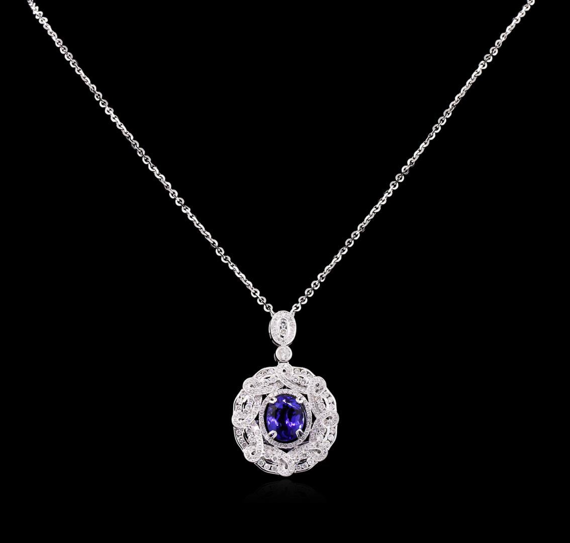 One electronically tested 14KT white gold Ladies combination cast & assembled pendant & chain 17.0" long, medium cable link with a lobster claw clasp with a bright polish finish. Condition is new. Identified with markings of "14K". Containing: One prong set round oval modified brilliant cut natural tanzanite, measuring 11.90 x 9.60 x 6.20mm, approximate weight of 4.80ct., clarity is eye clean, type I, medium light, very slightly grayish, violet color, (GIA V 4/3), cut is good. Colored gemstones are presumed to have been subjected to commonly used color/clarity enhancement processes. One bezel set round brilliant cut diamond, measuring 3.70 - 3.70 x 2.22mm (depth est.) approximate weight of 0.19ct. Clarity: I-2. Color: I, Cut is Good. One Hundred Seventy-Eight prong set round brilliant cut diamonds, measuring 1.90 - 1.30 x 0.96mm (depth est.) approximate. Total Weight of 178 Stones = 1.80ct. Clarity: I-1 to I-2. Color: I - J, Cut is Good. Total Weight of Colored Stones 4.80ct. Total Weight of Diamonds 1.99ct. Total Weight of Pendant & Chain 16.80 grams. GGL Appraised at $16,420.00.