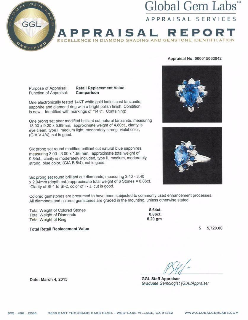 One electronically tested 14KT white gold ladies cast tanzanite, sapphire and diamond ring with a bright polish finish. Identified with markings of "14K". Condition is new. Containing: One prong set pear modified brilliant cut natural tanzanite, measuring 13.00. x 9.20 x 5.99mm, approximate weight of 4.80ct., clarity is eye clean, type I, medium light, moderately strong, violet color, (GIA V 4/4), cut is good. Six prong set round modified brilliant cut natural blue sapphires, measuring 3.00. - 3.00. x 1.96 mm, approximate total weight of 0.84ct., clarity is moderately included, type II, medium, moderately strong, blue color, (GIA B 5/4), cut is good. Six prong set round brilliant cut diamonds, measuring 3.40 - 3.40 x 2.04mm (depth est.) approximate total weight of 6 Stones = 0.86ct. Clarity: SI-1 to SI-2. Color: I - J, Cut is Good. Colored gemstones are presumed to have been subjected to commonly used enhancement processes. All diamonds and colored gemstones are graded in the mounting, unless otherwise stated. Total Weight of Colored Stones 5.64ct. Total Weight of Diamonds 0.86ct. Total Weight of Ring 6.20 grams. GGL Appraised at $5,720.00.
