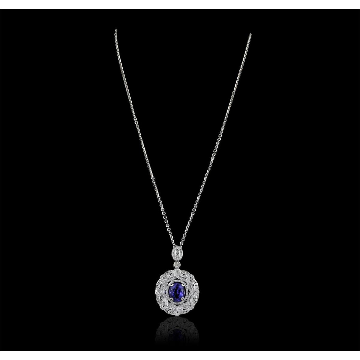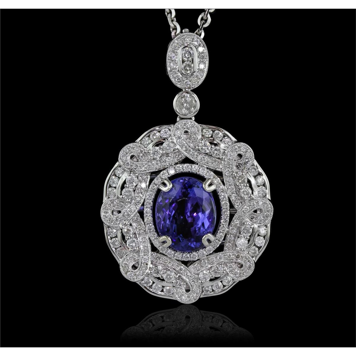 One electronically tested 14KT white gold Ladies combination cast & assembled pendant & chain 17.0" long, medium cable link with a lobster claw clasp with a bright polish finish. Condition is new. Identified with markings of "14K". Containing: One prong set round oval modified brilliant cut natural tanzanite, measuring 11.90 x 9.60 x 6.20mm, approximate weight of 4.80ct., clarity is eye clean, type I, medium light, very slightly grayish, violet color, (GIA V 4/3), cut is good. Colored gemstones are presumed to have been subjected to commonly used color/clarity enhancement processes. One bezel set round brilliant cut diamond, measuring 3.70 - 3.70 x 2.22mm (depth est.) approximate weight of 0.19ct. Clarity: I-2. Color: I, Cut is Good. One Hundred Seventy-Eight prong set round brilliant cut diamonds, measuring 1.90 - 1.30 x 0.96mm (depth est.) approximate. Total Weight of 178 Stones = 1.80ct. Clarity: I-1 to I-2. Color: I - J, Cut is Good. Total Weight of Colored Stones 4.80ct. Total Weight of Diamonds 1.99ct. Total Weight of Pendant & Chain 16.80 grams. GGL Appraised at $16,420.00.