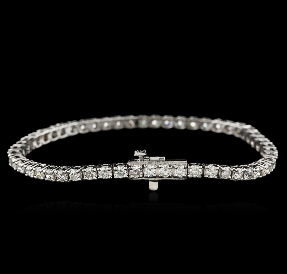 One electronically tested 14KT white gold ladies cast diamond tennis bracelet with a hidden box clasp with safety closer with a bright polish finish. Measurements: 7". Identified with markings of "14K". Condition is new. Containing: Fifty-Four prong set round brilliant cut diamonds, measuring 2.80 - 2.80 x 1.68mm (depth est.) approximate total weight of 54 Stones = 4.80ct. Clarity: I-1 to I-2. Color: H - J, Cut is Good. Diamonds are graded in the mounting, unless otherwise stated. Total Weight of Diamonds 4.80ct. Total Weight of Tennis Bracelet 13.50 grams. GGL Appraised at $8,495.00.