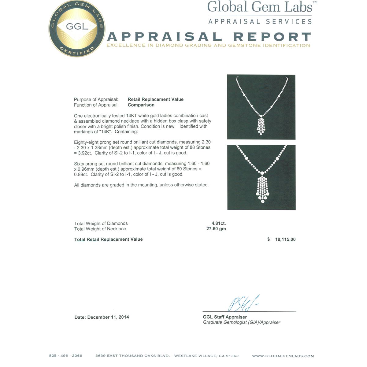 One electronically tested 14KT white gold ladies combination cast & assembled diamond necklace with a hidden box clasp with safety closer with a bright polish finish. Identified with markings of "14K". Condition is new. Containing: Eighty-Eight prong set round brilliant cut diamonds, measuring 2.30 - 2.30 x 1.38mm (depth est.) approximate total weight of 88 Stones = 3.92ct. Clarity: SI-2 to I-1. Color: I - J, Cut is Good. Sixty prong set round brilliant cut diamonds, measuring 1.60 - 1.60 x 0.96mm (depth est.) approximate total weight of 60 Stones = 0.89ct. Clarity: SI-2 to I-1. Color: I - J, Cut is Good. All diamonds are graded in the mounting, unless otherwise stated. Total Weight of Diamonds 4.81ct. Total Weight of Necklace 27.60 grams. GGL Appraised at $18,115.00.