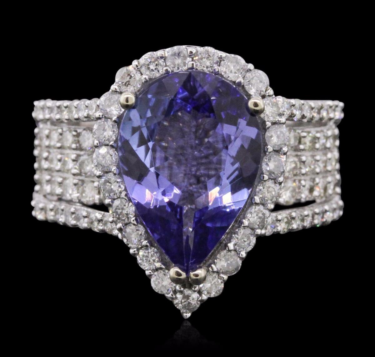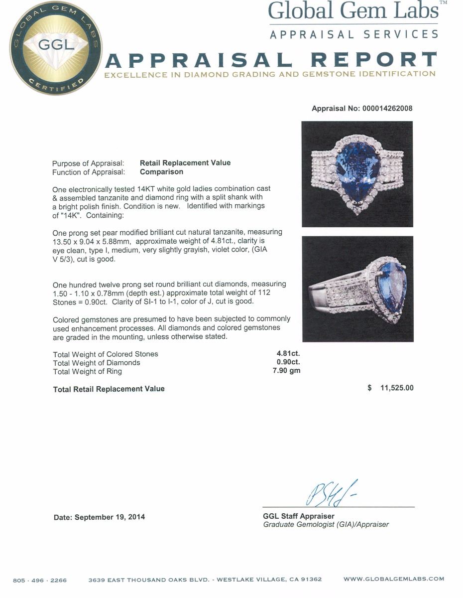 One electronically tested 14KT white gold ladies combination cast & assembled tanzanite and diamond ring with a split shank with a bright polish finish. Identified with markings of "14K". Condition is new. Containing: One prong set pear modified brilliant cut natural tanzanite, measuring 13.50 x 9.04 x 5.88mm, approximate weight of 4.81ct., clarity is eye clean, type I, medium, very slightly grayish, violet color, (GIA V 5/3), cut is good. One Hundred Twelve prong set round brilliant cut diamonds, measuring 1.50 - 1.10 x 0.78mm (depth est.) approximate total weight of 112 Stones = 0.90ct. Clarity: SI-1 to I-1. Color: J, Cut is Good. Colored gemstones are presumed to have been subjected to commonly used enhancement processes. All diamonds and colored gemstones are graded in the mounting, unless otherwise stated. Total Weight of Colored Stones 4.81ct. Total Weight of Diamonds 0.90ct. Total Weight of Ring 7.90 grams. GGL Appraised at $11,525.00.