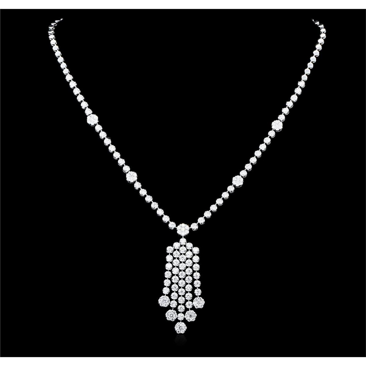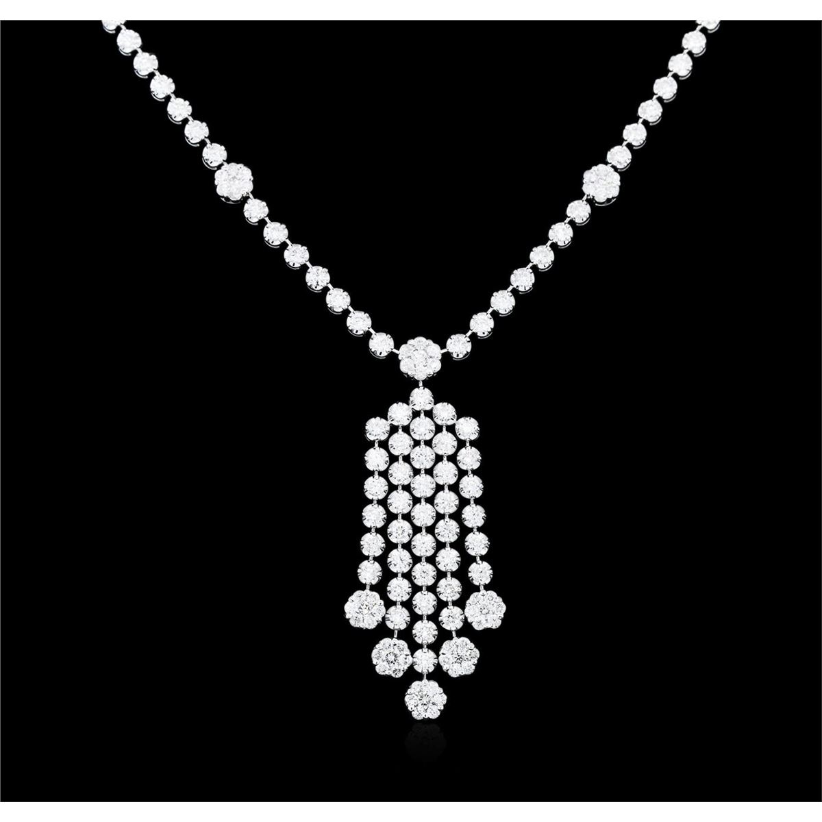 One electronically tested 14KT white gold ladies combination cast & assembled diamond necklace with a hidden box clasp with safety closer with a bright polish finish. Identified with markings of "14K". Condition is new. Containing: Eighty-Eight prong set round brilliant cut diamonds, measuring 2.30 - 2.30 x 1.38mm (depth est.) approximate total weight of 88 Stones = 3.92ct. Clarity: SI-2 to I-1. Color: I - J, Cut is Good. Sixty prong set round brilliant cut diamonds, measuring 1.60 - 1.60 x 0.96mm (depth est.) approximate total weight of 60 Stones = 0.89ct. Clarity: SI-2 to I-1. Color: I - J, Cut is Good. All diamonds are graded in the mounting, unless otherwise stated. Total Weight of Diamonds 4.81ct. Total Weight of Necklace 27.60 grams. GGL Appraised at $18,115.00.