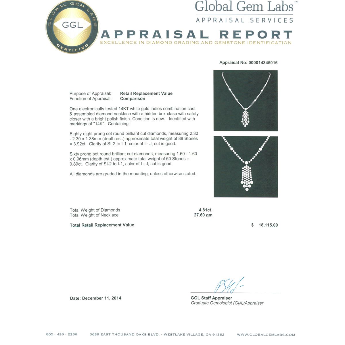 One electronically tested 14KT white gold ladies combination cast & assembled diamond necklace with a hidden box clasp with safety closer with a bright polish finish. Identified with markings of "14K". Condition is new. Containing: Eighty-Eight prong set round brilliant cut diamonds, measuring 2.30 - 2.30 x 1.38mm (depth est.) approximate total weight of 88 Stones = 3.92ct. Clarity: SI-2 to I-1. Color: I - J, Cut is Good. Sixty prong set round brilliant cut diamonds, measuring 1.60 - 1.60 x 0.96mm (depth est.) approximate total weight of 60 Stones = 0.89ct. Clarity: SI-2 to I-1. Color: I - J, Cut is Good. All diamonds are graded in the mounting, unless otherwise stated. Total Weight of Diamonds 4.81ct. Total Weight of Necklace 27.60 grams. GGL Appraised at $18,115.00.