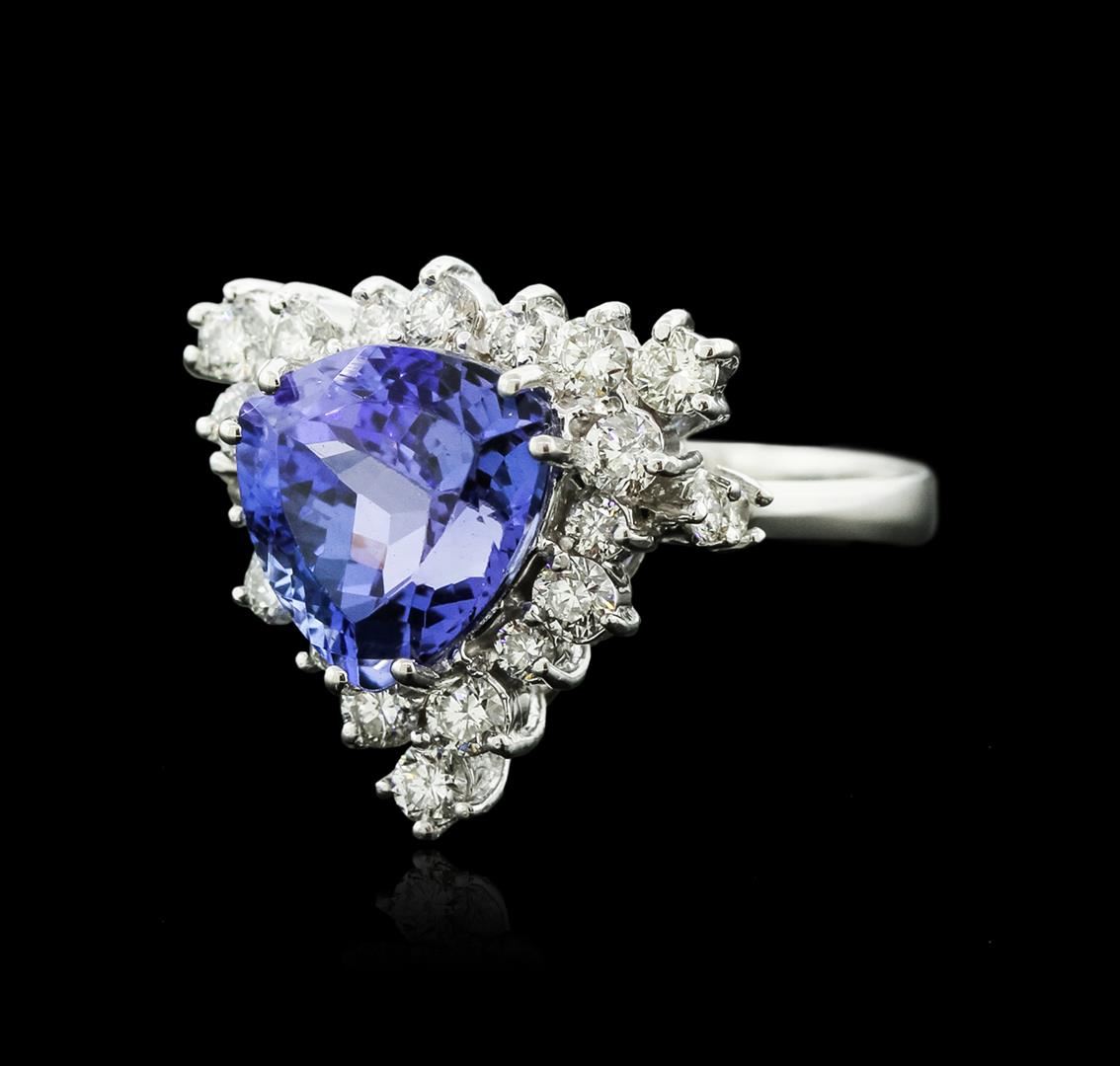 One electronically tested 14KT white gold ladies cast tanzanite and diamond ring with a bright and brushed finish. Identified with markings of "14K". Condition is new. Containing: One prong set triangle modified brilliant cut natural tanzanite, measuring 10.00. x 10.00. x 8.00.mm, approximate weight of 4.82ct., clarity is eye clean, type I, medium, very slightly grayish, bluish violet color, (GIA bV 5/3), cut is good. Twenty-Four prong set round brilliant cut diamonds, measuring 2.30 - 1.60 x 1.17mm (depth est.) approximate total weight of 24 Stones = 0.65ct. Clarity: SI-1 to I-1. Color: I - J. Colored gemstones are presumed to have been subjected to commonly used enhancement processes. All diamonds and colored gemstones are graded in the mounting, unless otherwise stated. Total Weight of Colored Stones 4.82ct. Total Weight of Diamonds 0.65ct. Total Weight of Ring 6.20 grams. GGL Appraised at $5,740.00.