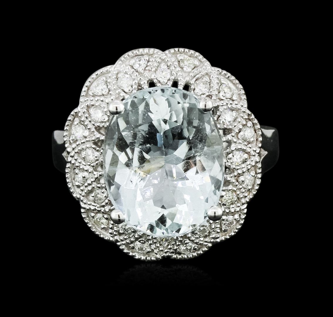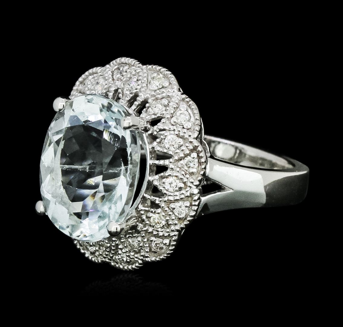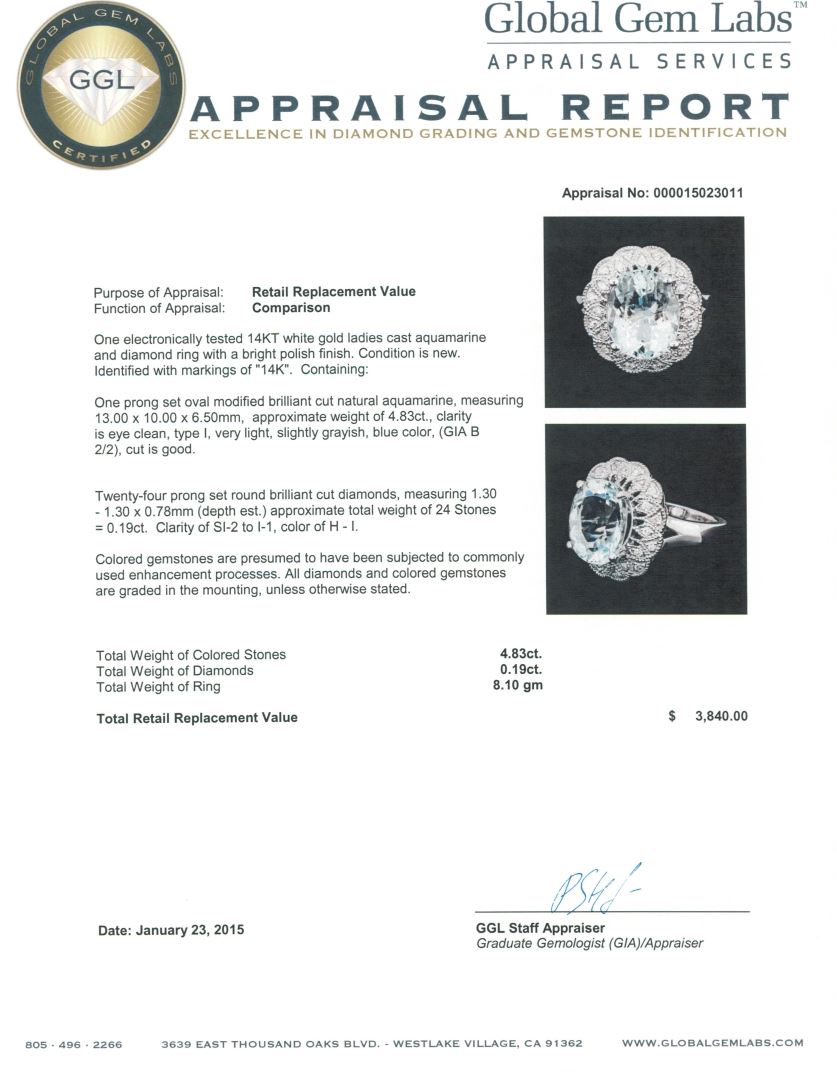 One electronically tested 14KT white gold ladies cast aquamarine and diamond ring with a bright polish finish. Identified with markings of "14K". Condition is new. Containing: One prong set oval modified brilliant cut natural aquamarine, measuring 13.00 x 10.00 x 6.50mm, approximate weight of 4.83ct., clarity is eye clean, type I, very light, slightly grayish, blue color, (GIA B 2/2), cut is good. Twenty-Four prong set round brilliant cut diamonds, measuring 1.30 - 1.30 x 0.78mm (depth est.) approximate total weight of 24 Stones = 0.19ct. Clarity: SI-2 to I-1. Color: H - I. Colored gemstones are presumed to have been subjected to commonly used enhancement processes. All diamonds and colored gemstones are graded in the mounting, unless otherwise stated. Total Weight of Colored Stones 4.83ct. Total Weight of Diamonds 0.19ct. Total Weight of Ring 8.10 grams. GGL Appraised at $3,840.00.