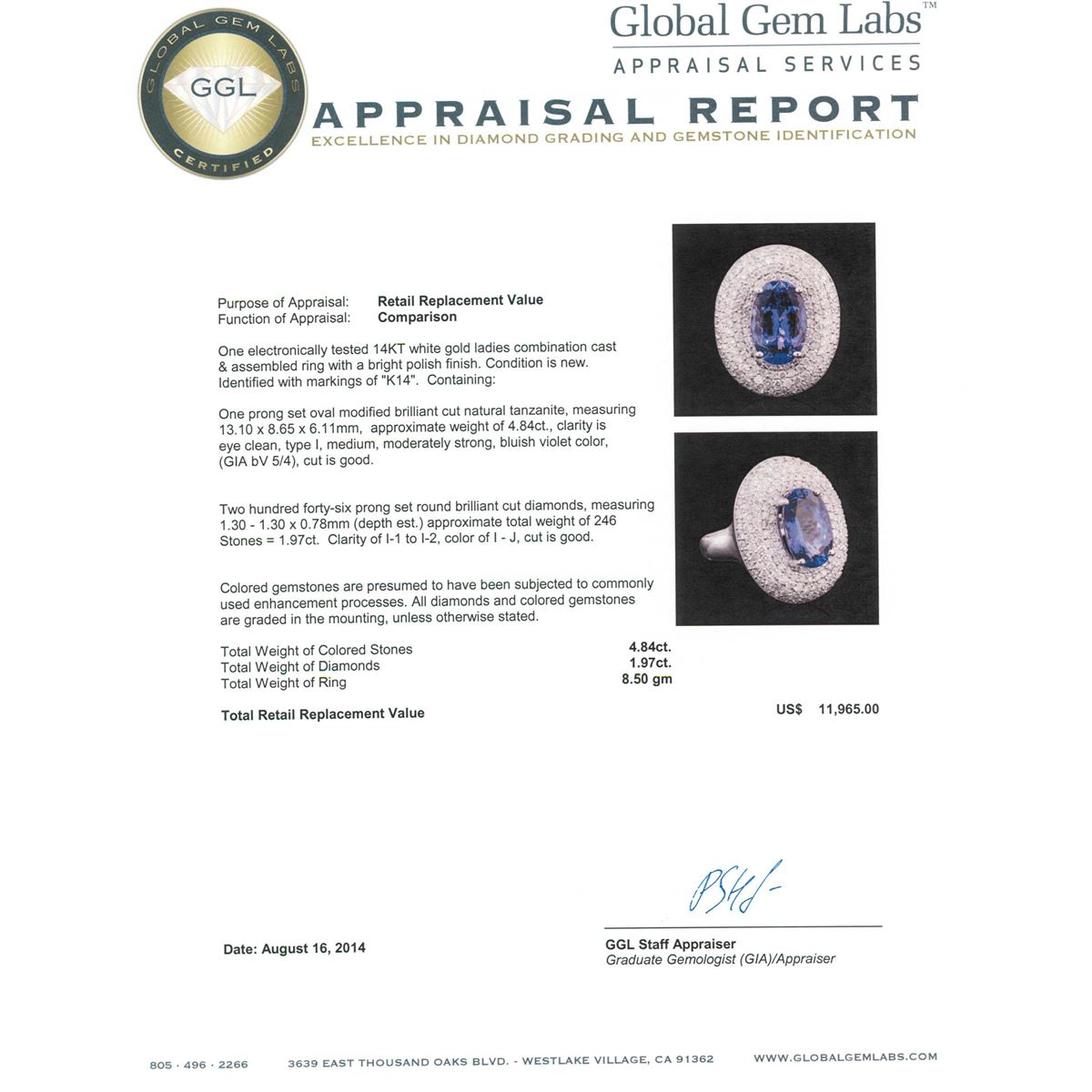 One electronically tested 14KT white gold ladies combination cast & assembled ring with a bright polish finish. Condition is new. Identified with markings of "K14". Containing: One prong set oval modified brilliant cut natural tanzanite, measuring 13.10 x 8.65 x 6.11mm, approximate weight of 4.84ct., clarity is eye clean, type I, medium, moderately strong, bluish violet color, (GIA bV 5/4), cut is good. Two Hundred Forty-Six prong set round brilliant cut diamonds, measuring 1.30 - 1.30 x 0.78mm (depth est.) approximate. Total Weight of 246 Stones = 1.97ct. Clarity: I-1 to I-2. Color: I - J, Cut is Good. Colored gemstones are presumed to have been subjected to commonly used enhancement processes. All diamonds and colored gemstones are graded in the mounting, unless otherwise stated. Total Weight of Colored Stones 4.84ct. Total Weight of Diamonds 1.97ct. Total Weight of Ring 8.50 grams. GGL Appraised at $11,965.00.