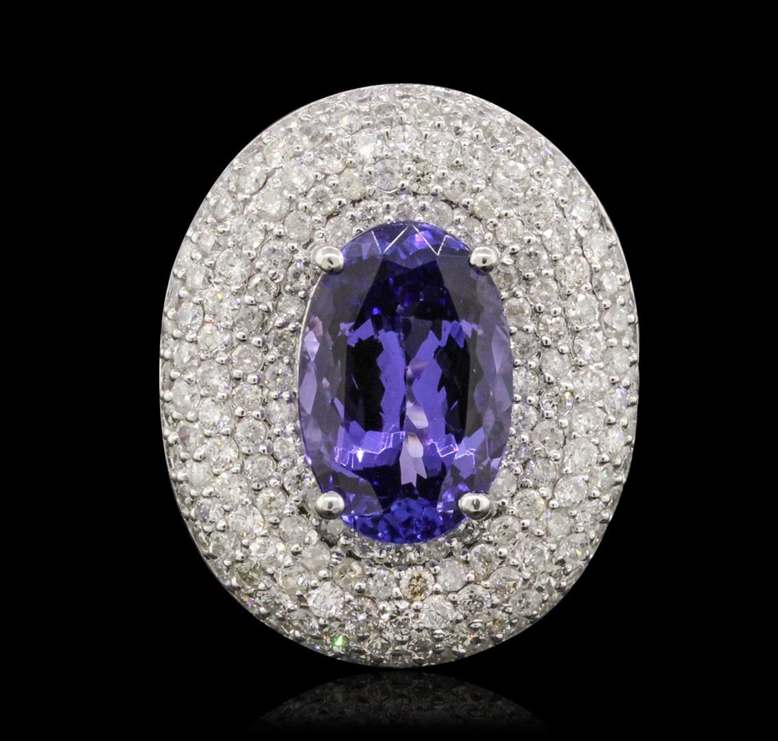 One electronically tested 14KT white gold ladies combination cast & assembled ring with a bright polish finish. Condition is new. Identified with markings of "K14". Containing: One prong set oval modified brilliant cut natural tanzanite, measuring 13.10 x 8.65 x 6.11mm, approximate weight of 4.84ct., clarity is eye clean, type I, medium, moderately strong, bluish violet color, (GIA bV 5/4), cut is good. Two Hundred Forty-Six prong set round brilliant cut diamonds, measuring 1.30 - 1.30 x 0.78mm (depth est.) approximate. Total Weight of 246 Stones = 1.97ct. Clarity: I-1 to I-2. Color: I - J, Cut is Good. Colored gemstones are presumed to have been subjected to commonly used enhancement processes. All diamonds and colored gemstones are graded in the mounting, unless otherwise stated. Total Weight of Colored Stones 4.84ct. Total Weight of Diamonds 1.97ct. Total Weight of Ring 8.50 grams. GGL Appraised at $11,965.00.