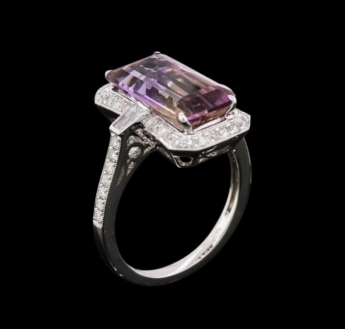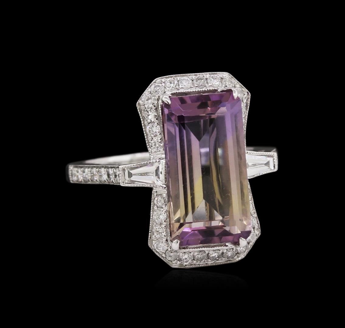 One electronically tested 14KT white gold ladies cast ametrine and diamond ring. Condition is new, good workmanship. The featured ametrine is set within a diamond bezel supported by diamond set shoulders, completed by a one and one-half millimeter wide band. Bright polish finish with milgrain detailing. Identified with markings of "14K 585". Containing: One prong set rectangular step cut natural ametrine quartz, measuring 13.60 x 7.50 x 5.60mm, 5%. bulge factor, approximate weight of 4.89ct., clarity is eye clean, type I, medium, very slightly grayish, purple color, (GIA P 5/3) to medium light, brownish, orangy yellow, (GIA oY 4/3), cut is good. Transmitting light with no distortion, transparent. Graded in the setting. Two bezel set baguette cut (tapered) diamonds, measuring from 4.00 x 1.80 x 1.26mm (depth est.) to 4.10 x 1.90 x 1.33mm (depth est.) approximate. Total Weight of 2 Stones = 0.18ct. Graded in the setting. Clarity: VVS-2 to VS-1. Color: G Forty-Two bead set round brilliant cut diamonds, measuring 1.30 - 1.30 x 0.78mm (depth est.) approximate. Total Weight of 42 Stones = 0.44ct. Graded in the setting. Clarity: SI-1 to I-1. Color: G - I. Total Weight of Colored Stones 4.89ct. Total Weight of Diamonds 0.62ct. Total Weight of Ring 4.86 grams. AIG Appraised at $3,230.00.