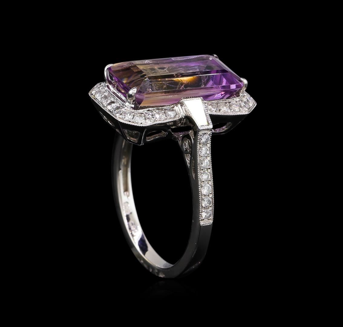 One electronically tested 14KT white gold ladies cast ametrine and diamond ring. Condition is new, good workmanship. The featured ametrine is set within a diamond bezel supported by diamond set shoulders, completed by a one and one-half millimeter wide band. Bright polish finish with milgrain detailing. Identified with markings of "14K 585". Containing: One prong set rectangular step cut natural ametrine quartz, measuring 13.60 x 7.50 x 5.60mm, 5%. bulge factor, approximate weight of 4.89ct., clarity is eye clean, type I, medium, very slightly grayish, purple color, (GIA P 5/3) to medium light, brownish, orangy yellow, (GIA oY 4/3), cut is good. Transmitting light with no distortion, transparent. Graded in the setting. Two bezel set baguette cut (tapered) diamonds, measuring from 4.00 x 1.80 x 1.26mm (depth est.) to 4.10 x 1.90 x 1.33mm (depth est.) approximate. Total Weight of 2 Stones = 0.18ct. Graded in the setting. Clarity: VVS-2 to VS-1. Color: G Forty-Two bead set round brilliant cut diamonds, measuring 1.30 - 1.30 x 0.78mm (depth est.) approximate. Total Weight of 42 Stones = 0.44ct. Graded in the setting. Clarity: SI-1 to I-1. Color: G - I. Total Weight of Colored Stones 4.89ct. Total Weight of Diamonds 0.62ct. Total Weight of Ring 4.86 grams. AIG Appraised at $3,230.00.