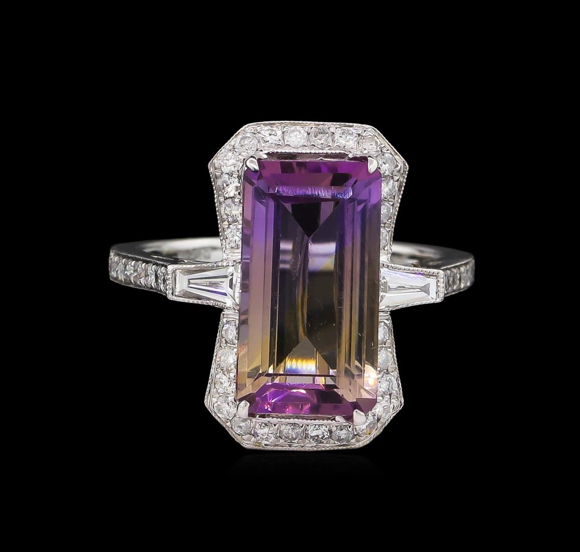 One electronically tested 14KT white gold ladies cast ametrine and diamond ring. Condition is new, good workmanship. The featured ametrine is set within a diamond bezel supported by diamond set shoulders, completed by a one and one-half millimeter wide band. Bright polish finish with milgrain detailing. Identified with markings of "14K 585". Containing: One prong set rectangular step cut natural ametrine quartz, measuring 13.60 x 7.50 x 5.60mm, 5%. bulge factor, approximate weight of 4.89ct., clarity is eye clean, type I, medium, very slightly grayish, purple color, (GIA P 5/3) to medium light, brownish, orangy yellow, (GIA oY 4/3), cut is good. Transmitting light with no distortion, transparent. Graded in the setting. Two bezel set baguette cut (tapered) diamonds, measuring from 4.00 x 1.80 x 1.26mm (depth est.) to 4.10 x 1.90 x 1.33mm (depth est.) approximate. Total Weight of 2 Stones = 0.18ct. Graded in the setting. Clarity: VVS-2 to VS-1. Color: G Forty-Two bead set round brilliant cut diamonds, measuring 1.30 - 1.30 x 0.78mm (depth est.) approximate. Total Weight of 42 Stones = 0.44ct. Graded in the setting. Clarity: SI-1 to I-1. Color: G - I. Total Weight of Colored Stones 4.89ct. Total Weight of Diamonds 0.62ct. Total Weight of Ring 4.86 grams. AIG Appraised at $3,230.00.