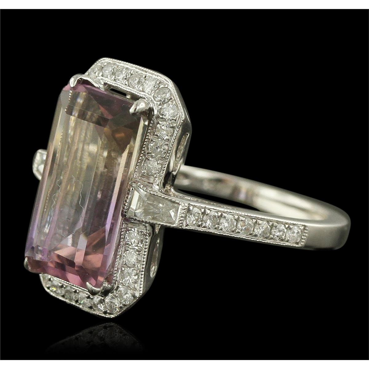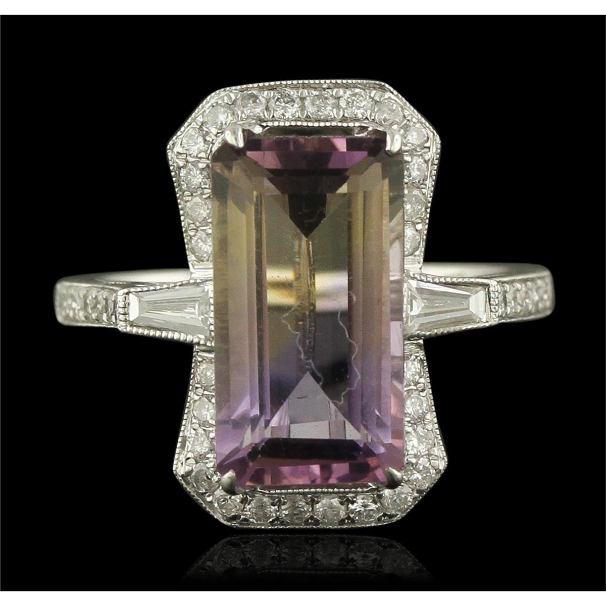 One electronically tested 14KT white gold ladies cast ametrine and diamond ring. Condition is new, good workmanship. The featured ametrine is set within a diamond bezel supported by diamond set shoulders, completed by a one and one-half millimeter wide band. Bright polish finish with milgrain detailing. Identified with markings of "14K 585". Containing: One prong set rectangular step cut natural ametrine quartz, measuring 13.60 x 7.50 x 5.60mm, 5%. bulge factor, approximate weight of 4.89ct., clarity is eye clean, type I, medium, very slightly grayish, purple color, (GIA P 5/3) to medium light, brownish, orangy yellow, (GIA oY 4/3), cut is good. Transmitting light with no distortion, transparent. Graded in the setting. Two bezel set baguette cut (tapered) diamonds, measuring from 4.00 x 1.80 x 1.26mm (depth est.) to 4.10 x 1.90 x 1.33mm (depth est.) approximate. Total Weight of 2 Stones = 0.18ct. Graded in the setting. Clarity: VVS-2 to VS-1. Color: G Forty-Two bead set round brilliant cut diamonds, measuring 1.30 - 1.30 x 0.78mm (depth est.) approximate. Total Weight of 42 Stones = 0.44ct. Graded in the setting. Clarity: SI-1 to I-1. Color: G - I. Total Weight of Colored Stones 4.89ct. Total Weight of Diamonds 0.62ct. Total Weight of Ring 4.86 grams. AIG Appraised at $3,230.00.