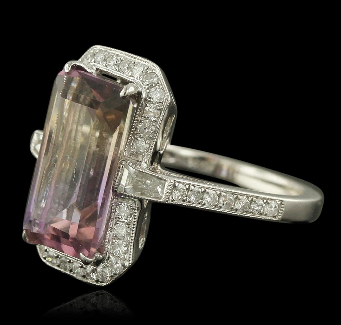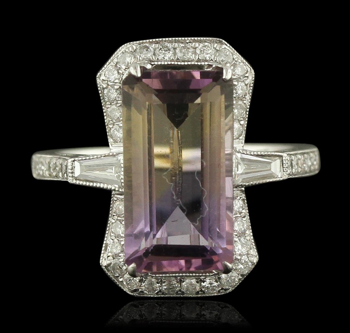 One electronically tested 14KT white gold ladies cast ametrine and diamond ring. Condition is new, good workmanship. The featured ametrine is set within a diamond bezel supported by diamond set shoulders, completed by a one and one-half millimeter wide band. Bright polish finish with milgrain detailing. Identified with markings of "14K 585". Containing: One prong set rectangular step cut natural ametrine quartz, measuring 13.60 x 7.50 x 5.60mm, 5%. bulge factor, approximate weight of 4.89ct., clarity is eye clean, type I, medium, very slightly grayish, purple color, (GIA P 5/3) to medium light, brownish, orangy yellow, (GIA oY 4/3), cut is good. Transmitting light with no distortion, transparent. Graded in the setting. Two bezel set baguette cut (tapered) diamonds, measuring from 4.00 x 1.80 x 1.26mm (depth est.) to 4.10 x 1.90 x 1.33mm (depth est.) approximate. Total Weight of 2 Stones = 0.18ct. Graded in the setting. Clarity: VVS-2 to VS-1. Color: G Forty-Two bead set round brilliant cut diamonds, measuring 1.30 - 1.30 x 0.78mm (depth est.) approximate. Total Weight of 42 Stones = 0.44ct. Graded in the setting. Clarity: SI-1 to I-1. Color: G - I. Total Weight of Colored Stones 4.89ct. Total Weight of Diamonds 0.62ct. Total Weight of Ring 4.86 grams. AIG Appraised at $3,230.00.