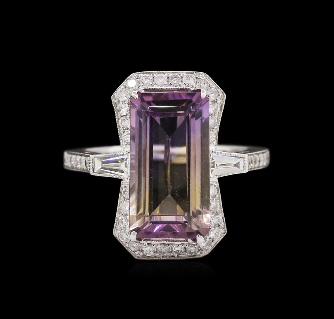 One electronically tested 14KT white gold ladies cast ametrine and diamond ring. Condition is new, good workmanship. The featured ametrine is set within a diamond bezel supported by diamond set shoulders, completed by a one and one-half millimeter wide band. Bright polish finish with milgrain detailing. Identified with markings of "14K 585". Containing: One prong set rectangular step cut natural ametrine quartz, measuring 13.60 x 7.50 x 5.60mm, 5%. bulge factor, approximate weight of 4.89ct., clarity is eye clean, type I, medium, very slightly grayish, purple color, (GIA P 5/3) to medium light, brownish, orangy yellow, (GIA oY 4/3), cut is good. Transmitting light with no distortion, transparent. Graded in the setting. Two bezel set baguette cut (tapered) diamonds, measuring from 4.00 x 1.80 x 1.26mm (depth est.) to 4.10 x 1.90 x 1.33mm (depth est.) approximate. Total Weight of 2 Stones = 0.18ct. Graded in the setting. Clarity: VVS-2 to VS-1. Color: G Forty-Two bead set round brilliant cut diamonds, measuring 1.30 - 1.30 x 0.78mm (depth est.) approximate. Total Weight of 42 Stones = 0.44ct. Graded in the setting. Clarity: SI-1 to I-1. Color: G - I. Total Weight of Colored Stones 4.89ct. Total Weight of Diamonds 0.62ct. Total Weight of Ring 4.86 grams. AIG Appraised at $3,230.00.
