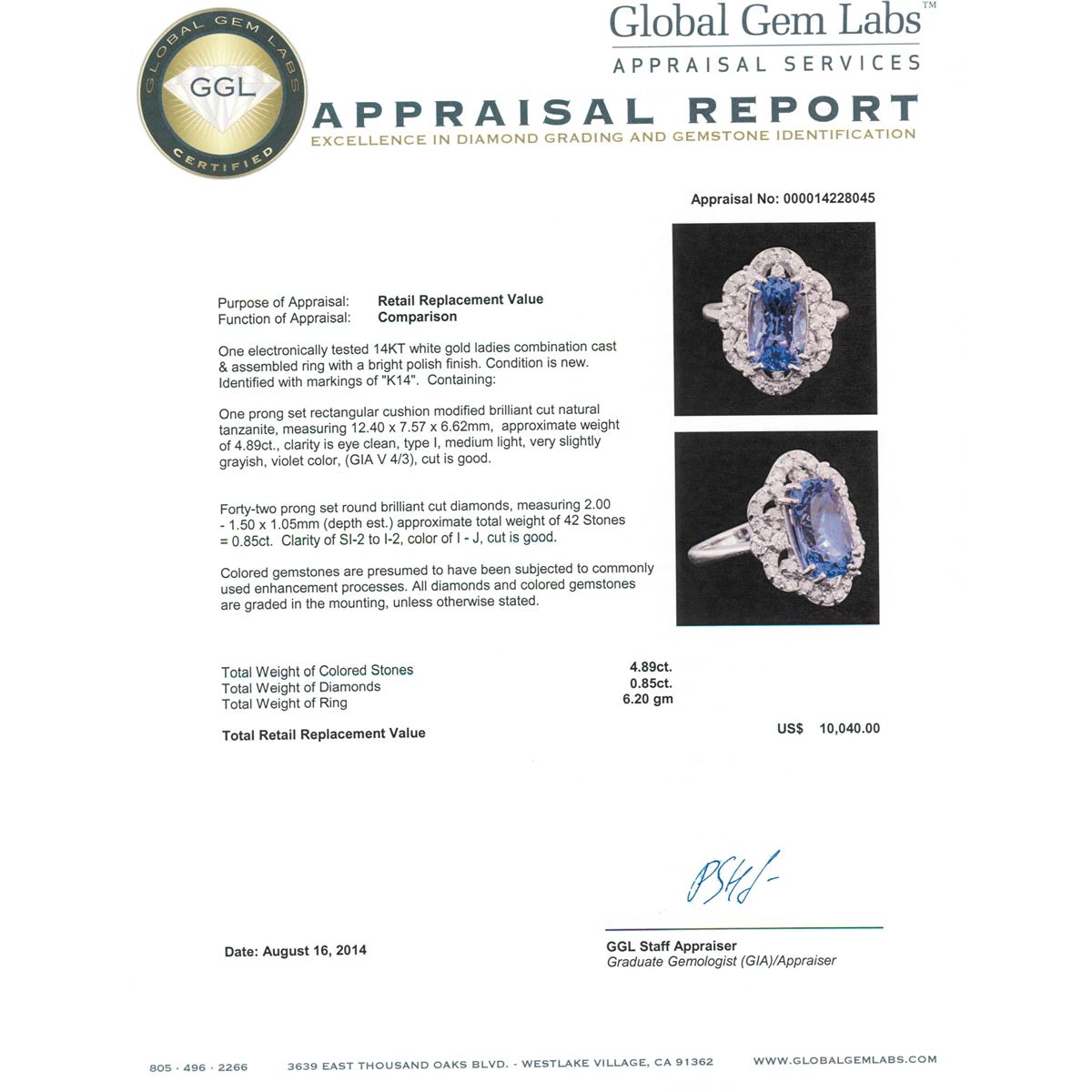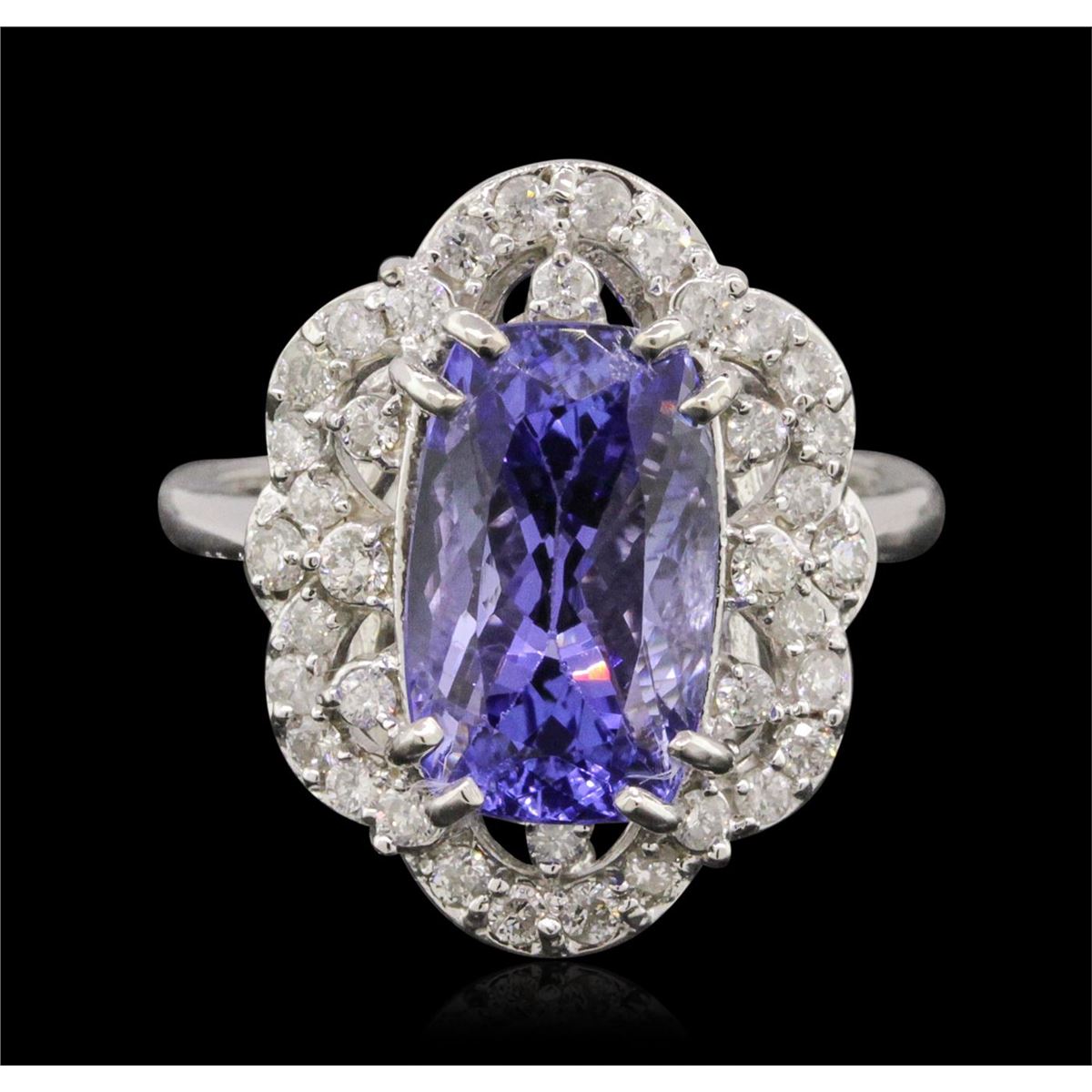 One electronically tested 14KT white gold ladies combination cast & assembled ring with a bright polish finish. Condition is new. Identified with markings of "K14". Containing: One prong set rectangular cushion modified brilliant cut natural tanzanite, measuring 12.40 x 7.57 x 6.62mm, approximate weight of 4.89ct., clarity is eye clean, type I, medium light, very slightly grayish, violet color, (GIA V 4/3), cut is good. Forty-Two prong set round brilliant cut diamonds, measuring 2.00 - 1.50 x 1.05mm (depth est.) approximate. Total Weight of 42 Stones = 0.85ct. Clarity: SI-2 to I-2. Color: I - J, Cut is Good. Colored gemstones are presumed to have been subjected to commonly used enhancement processes. All diamonds and colored gemstones are graded in the mounting, unless otherwise stated. Total Weight of Colored Stones 4.89ct. Total Weight of Diamonds 0.85ct. Total Weight of Ring 6.20 grams. GGL Appraised at $10,040.00.