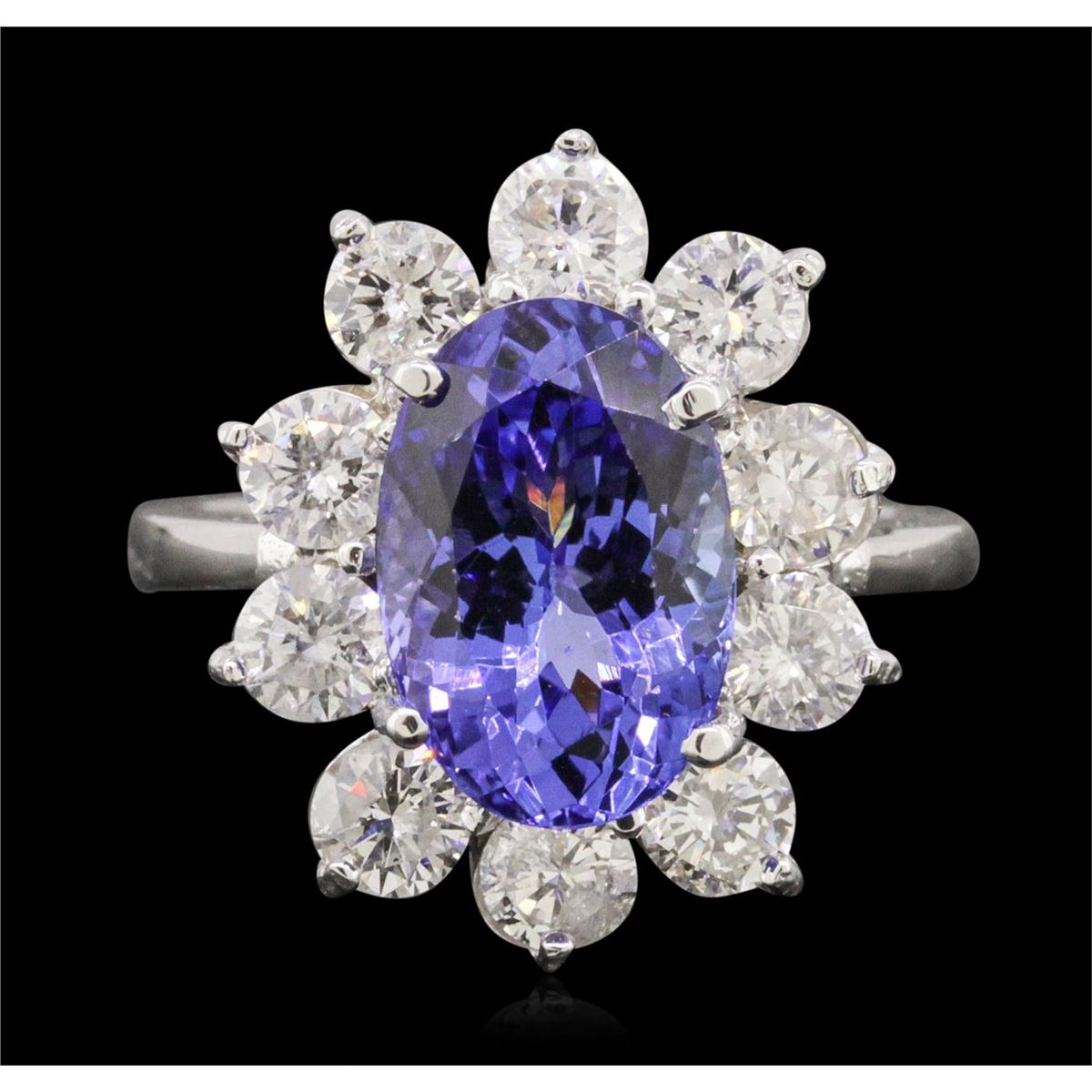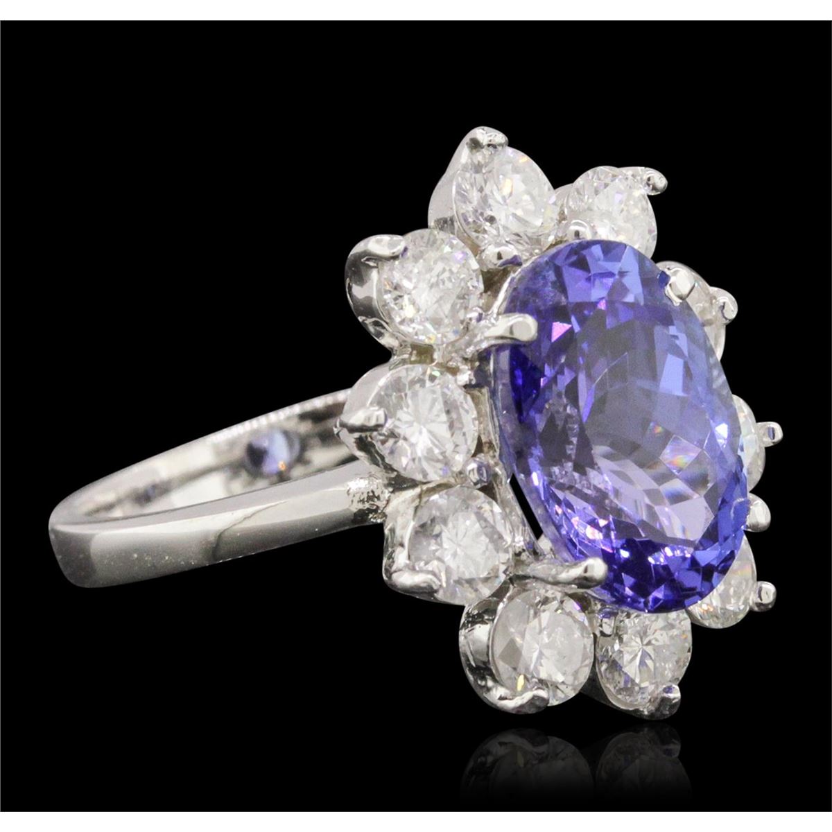 One electronically tested 14KT white gold ladies combination cast & assembled ring with a bright polish finish. Condition is new. Identified with markings of "K14". Containing: One prong set oval modified brilliant cut natural tanzanite, measuring 12.40 x 8.40 x 6.75mm, approximate weight of 4.89ct., clarity is eye clean, type I, medium, moderately strong, bluish violet color, (GIA bV 5/4), cut is good. Ten prong set round brilliant cut diamonds, measuring 3.80 - 3.80 x 2.28mm (depth est.) approximate total weight of 10 Stones = 2.01ct. Clarity: SI-2 to I-1. Color: J, Cut is Good. Colored gemstones are presumed to have been subjected to commonly used enhancement processes. All diamonds and colored gemstones are graded in the mounting, unless otherwise stated. Total Weight of Colored Stones 4.89ct. Total Weight of Diamonds 2.01ct. Total Weight of Ring 7.00 grams. GGL Appraised at $15,305.00.