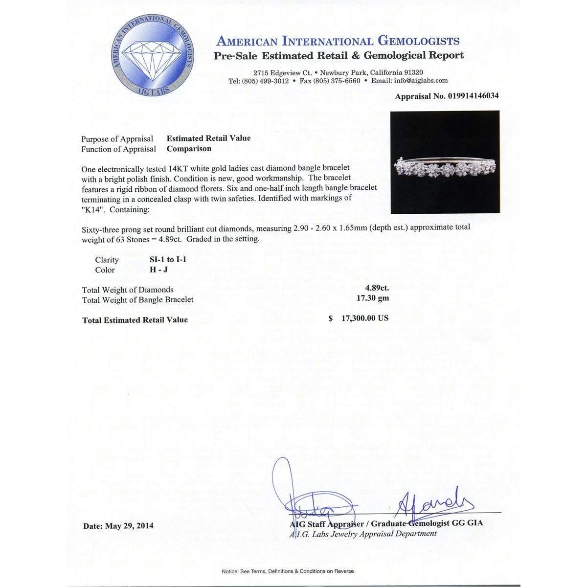 One electronically tested 14KT white gold ladies cast diamond bangle bracelet with a bright polish finish. Condition is new, good workmanship. The bracelet features a rigid ribbon of diamond florets. Six and one-half inch length bangle bracelet terminating in a concealed clasp with twin safeties. Identified with markings of "K14". Containing: Sixty-Three prong set round brilliant cut diamonds, measuring 2.90 - 2.60 x 1.65mm (depth est.) approximate. Total Weight of 63 Stones = 4.89ct. Graded in the setting. Clarity: SI-1 to I-1 . Color: H - J. Total Weight of Diamonds 4.89ct.. Total Weight of Bangle Bracelet 17.30gm. AIG Appraised at $17,300.00.
