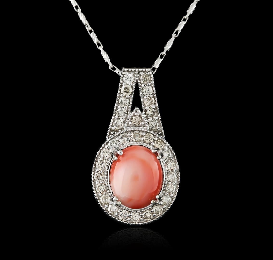 One electronically tested 14KT white gold ladies cast coral and diamond pendant & chain 18.0" long, with a lobster claw clasp with a bright polish finish. Identified with markings of "14K". Condition is new. Containing: One prong set oval cabochon cut natural pink coral, measuring 13.00 x 9.00 x 5.85mm, approximate weight of 4.90ct., clarity is heavily included, medium light, very slightly grayish, pink color, (GIA Pk 4/3), cut is good. Thirty-One prong set round brilliant cut diamonds, measuring 1.70 - 1.70 x 1.02mm (depth est.) approximate total weight of 31 Stones = 0.56ct. Clarity: SI-2 to I-1. Color: I - J, Cut is Good. Diamonds and colored gemstones are graded in the mounting, unless otherwise stated. Colored gemstones are presumed to have been subjected to commonly used enhancement processes. Total Weight of Colored Stones 4.90ct. Total Weight of Diamonds 0.56ct. Total Weight of Pendant & Chain 9.30 grams. GGL Appraised at $2,785.00.