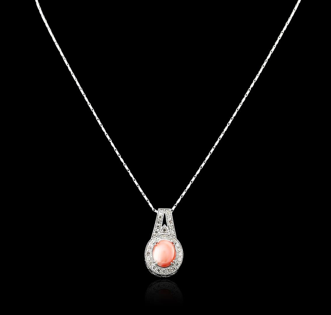 One electronically tested 14KT white gold ladies cast coral and diamond pendant & chain 18.0" long, with a lobster claw clasp with a bright polish finish. Identified with markings of "14K". Condition is new. Containing: One prong set oval cabochon cut natural pink coral, measuring 13.00 x 9.00 x 5.85mm, approximate weight of 4.90ct., clarity is heavily included, medium light, very slightly grayish, pink color, (GIA Pk 4/3), cut is good. Thirty-One prong set round brilliant cut diamonds, measuring 1.70 - 1.70 x 1.02mm (depth est.) approximate total weight of 31 Stones = 0.56ct. Clarity: SI-2 to I-1. Color: I - J, Cut is Good. Diamonds and colored gemstones are graded in the mounting, unless otherwise stated. Colored gemstones are presumed to have been subjected to commonly used enhancement processes. Total Weight of Colored Stones 4.90ct. Total Weight of Diamonds 0.56ct. Total Weight of Pendant & Chain 9.30 grams. GGL Appraised at $2,785.00.