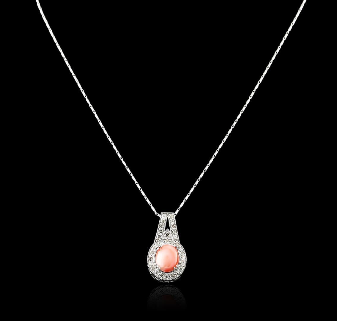 One electronically tested 14KT white gold ladies cast coral and diamond pendant & chain 18.0" long, with a lobster claw clasp with a bright polish finish. Identified with markings of "14K". Condition is new. Containing: One prong set oval cabochon cut natural pink coral, measuring 13.00 x 9.00 x 5.85mm, approximate weight of 4.90 ct., clarity is heavily included, medium light, very slightly grayish, pink color, (GIA Pk 4/3), cut is good. Thirty-One prong set round brilliant cut diamonds, measuring 1.70 - 1.70 x 1.02mm (depth est.) approximate total weight of 31 Stones = 0.56ct. Clarity: SI-2 to I-1. Color: I - J, Cut is Good. Diamonds and colored gemstones are graded in the mounting, unless otherwise stated. Colored gemstones are presumed to have been subjected to commonly used enhancement processes. Total Weight of Colored Stones 4.90 ct. Total Weight of Diamonds 0.56ct. Total Weight of Pendant & Chain 9.30 grams. GGL Appraised.