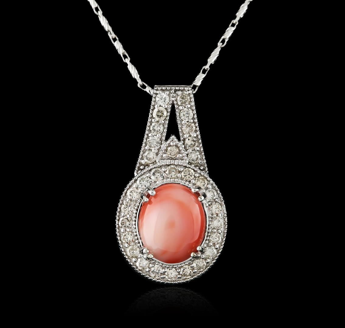 One electronically tested 14KT white gold ladies cast coral and diamond pendant & chain 18.0" long, with a lobster claw clasp with a bright polish finish. Identified with markings of "14K". Condition is new. Containing: One prong set oval cabochon cut natural pink coral, measuring 13.00 x 9.00 x 5.85mm, approximate weight of 4.90 ct., clarity is heavily included, medium light, very slightly grayish, pink color, (GIA Pk 4/3), cut is good. Thirty-One prong set round brilliant cut diamonds, measuring 1.70 - 1.70 x 1.02mm (depth est.) approximate total weight of 31 Stones = 0.56ct. Clarity: SI-2 to I-1. Color: I - J, Cut is Good. Diamonds and colored gemstones are graded in the mounting, unless otherwise stated. Colored gemstones are presumed to have been subjected to commonly used enhancement processes. Total Weight of Colored Stones 4.90 ct. Total Weight of Diamonds 0.56ct. Total Weight of Pendant & Chain 9.30 grams. GGL Appraised.