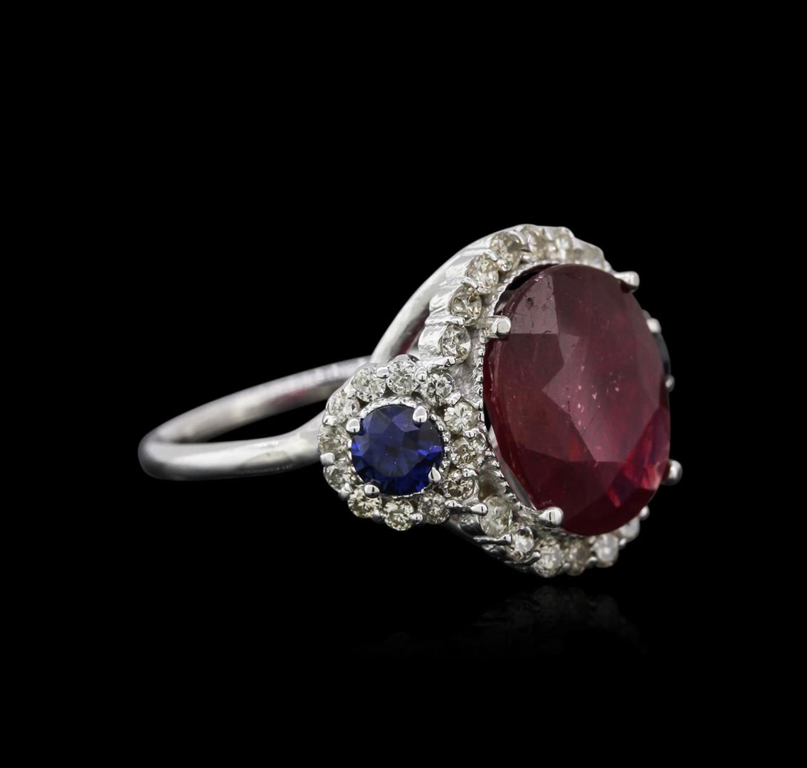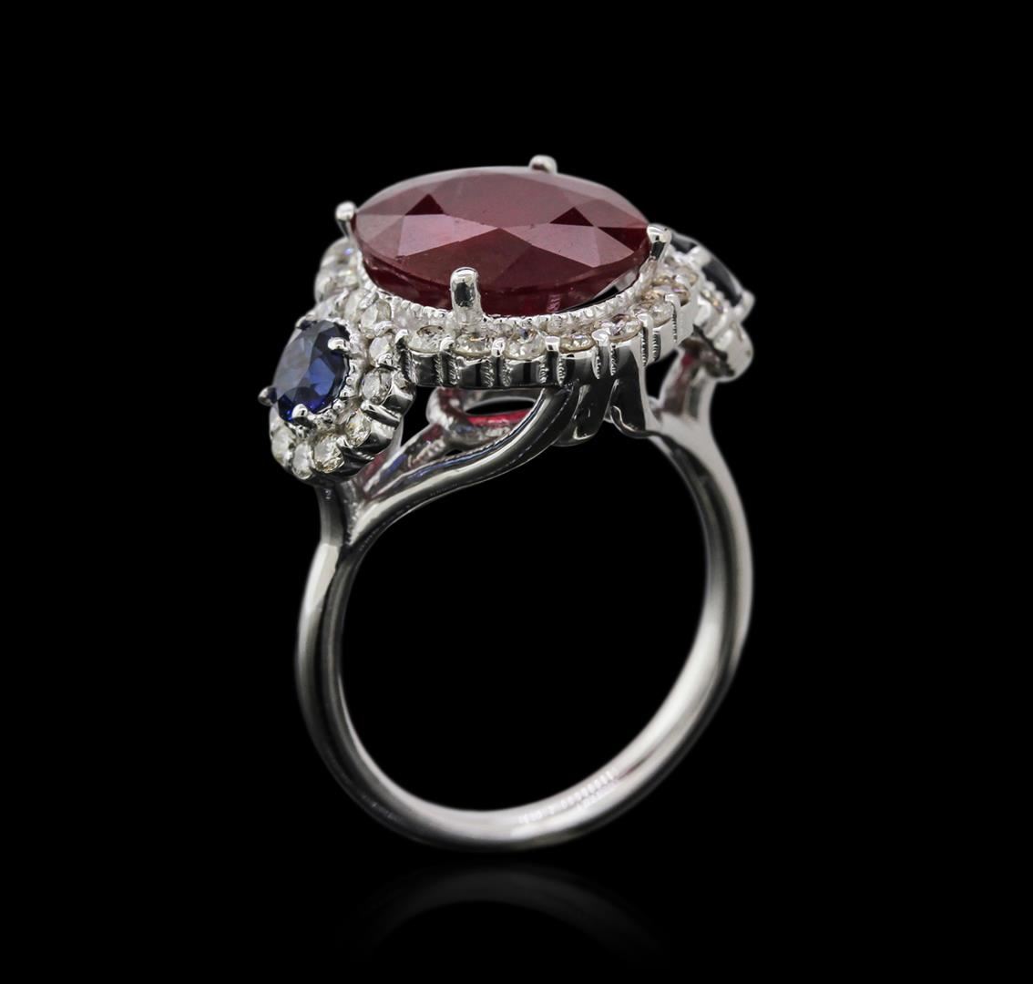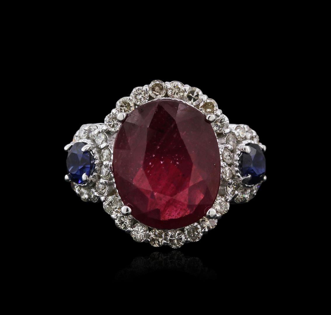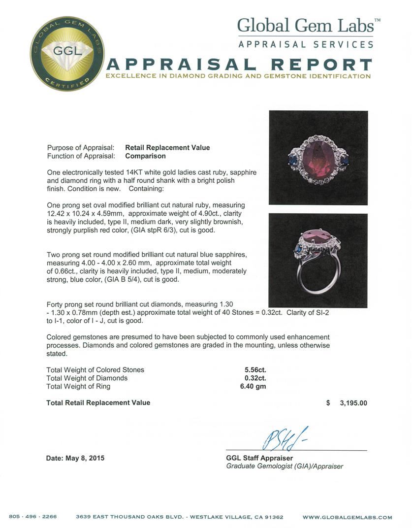 One electronically tested 14KT white gold ladies cast ruby, sapphire and diamond ring with a half round shank with a bright polish finish. Condition is new. Containing: One prong set oval modified brilliant cut natural ruby, measuring 12.42 x 10.24 x 4.59mm, approximate weight of 4.90ct., clarity is heavily included, type II, medium dark, very slightly brownish, strongly purplish red color, (GIA stpR 6/3), cut is good. Two prong set round modified brilliant cut natural blue sapphires, measuring 4.00 - 4.00 x 2.60 mm, approximate weight of 0.66ct., clarity is heavily included, type II, medium, moderately strong, blue color, (GIA B 5/4), cut is good. Forty prong set round brilliant cut diamonds, measuring 1.30 - 1.30 x 0.78mm (depth est.) approximate total weight of 40 Stones = 0.32ct. Clarity: SI-2 to I-1. Color: I - J, Cut is Good. Colored gemstones are presumed to have been subjected to commonly used enhancement processes. Diamonds and colored gemstones are graded in the mounting, unless otherwise stated. Total Weight of Colored Stones 5.56ct. Total Weight of Diamonds 0.32ct. Total Weight of Ring 6.40 grams. GGL Appraised at $3,195.00.