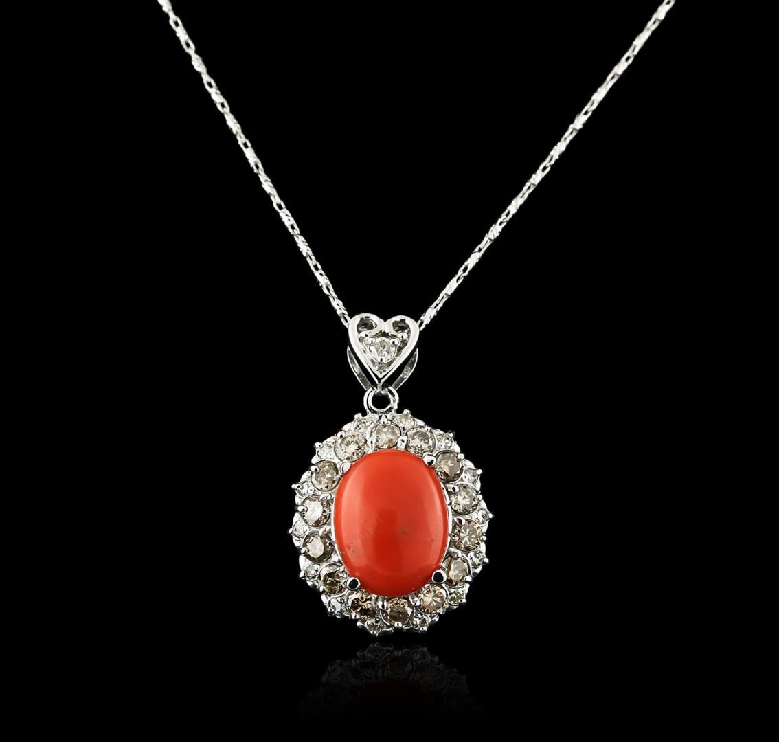 One electronically tested 14KT white gold ladies cast coral and diamond pendant & chain 18.0" long, with a lobster claw clasp with a bright polish finish. Identified with markings of "14K". Condition is new. Containing: One prong set oval cabochon cut natural red coral, measuring 13.00 x 9.00 x 5.85mm, approximate weight of 4.90ct., clarity is heavily included, medium, brownish, red color, (GIA R 5/1), cut is good. Fourteen prong set round brilliant cut diamonds, measuring 2.50 - 2.50 x 1.50mm (depth est.) approximate total weight of 14 Stones = 0.80ct. Clarity: I-1 to I-2, Cut is Good. Fifteen prong set round brilliant cut diamonds, measuring 1.50 - 1.50 x 0.90mm (depth est.) approximate total weight of 15 Stones = 0.19ct. Clarity: SI-2 to I-2. Color: J - K, Cut is Good. Diamonds and colored gemstones are graded in the mounting, unless otherwise stated. Colored gemstones are presumed to have been subjected to commonly used enhancement processes. Total Weight of Colored Stones 4.90ct. Total Weight of Diamonds 0.98ct. Total Weight of Pendant & Chain 7.20 grams. GGL Appraised at $3,230.00.