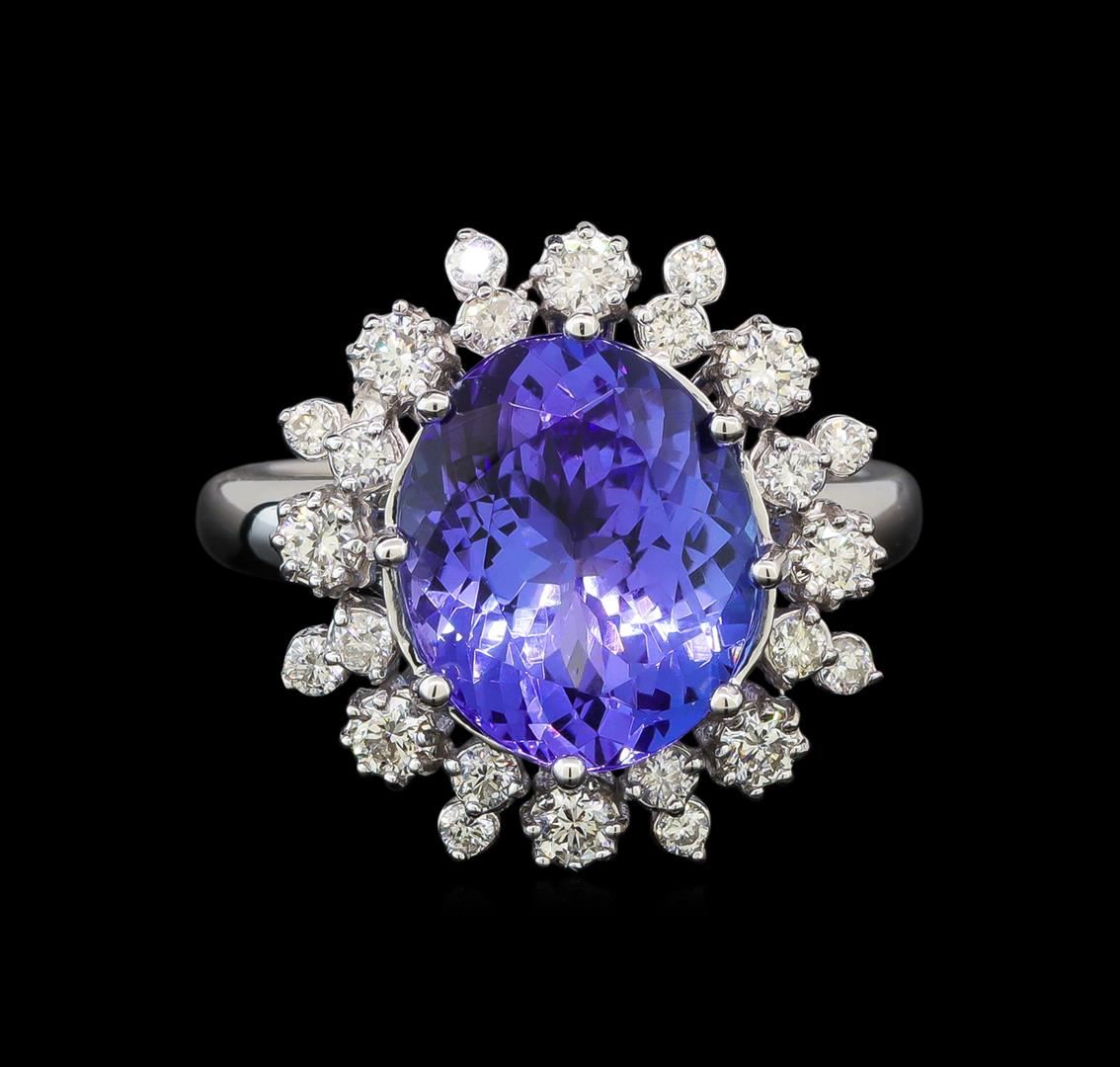 One electronically tested 14KT white gold ladies cast tanzanite and diamond ring with a bright polish finish. Identified with markings of "K14". Condition is new. Containing: One prong set oval modified brilliant cut natural tanzanite, measuring 11.90 x 9.50 x 6.18mm, approximate weight of 4.91ct., clarity is eye clean, type I, medium, very slightly grayish, violet color, (GIA V 5/3), cut is good. Twenty-Four prong set round brilliant cut diamonds, measuring 2.10 - 1.80 x 1.17mm (depth est.) approximate total weight of 24 Stones = 0.65ct. Clarity: SI-1 to SI-2. Color: I - J, Cut is Good. Colored gemstones are presumed to have been subjected to commonly used enhancement processes. All diamonds and colored gemstones are graded in the mounting, unless otherwise stated. Total Weight of Colored Stones 4.91ct. Total Weight of Diamonds 0.65ct. Total Weight of Ring 5.30 grams. GGL Appraised at $4,610.00.