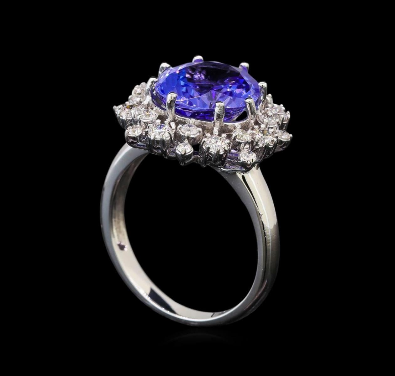 One electronically tested 14KT white gold ladies cast tanzanite and diamond ring with a bright polish finish. Identified with markings of "K14". Condition is new. Containing: One prong set oval modified brilliant cut natural tanzanite, measuring 11.90 x 9.50 x 6.18mm, approximate weight of 4.91ct., clarity is eye clean, type I, medium, very slightly grayish, violet color, (GIA V 5/3), cut is good. Twenty-Four prong set round brilliant cut diamonds, measuring 2.10 - 1.80 x 1.17mm (depth est.) approximate total weight of 24 Stones = 0.65ct. Clarity: SI-1 to SI-2. Color: I - J, Cut is Good. Colored gemstones are presumed to have been subjected to commonly used enhancement processes. All diamonds and colored gemstones are graded in the mounting, unless otherwise stated. Total Weight of Colored Stones 4.91ct. Total Weight of Diamonds 0.65ct. Total Weight of Ring 5.30 grams. GGL Appraised.