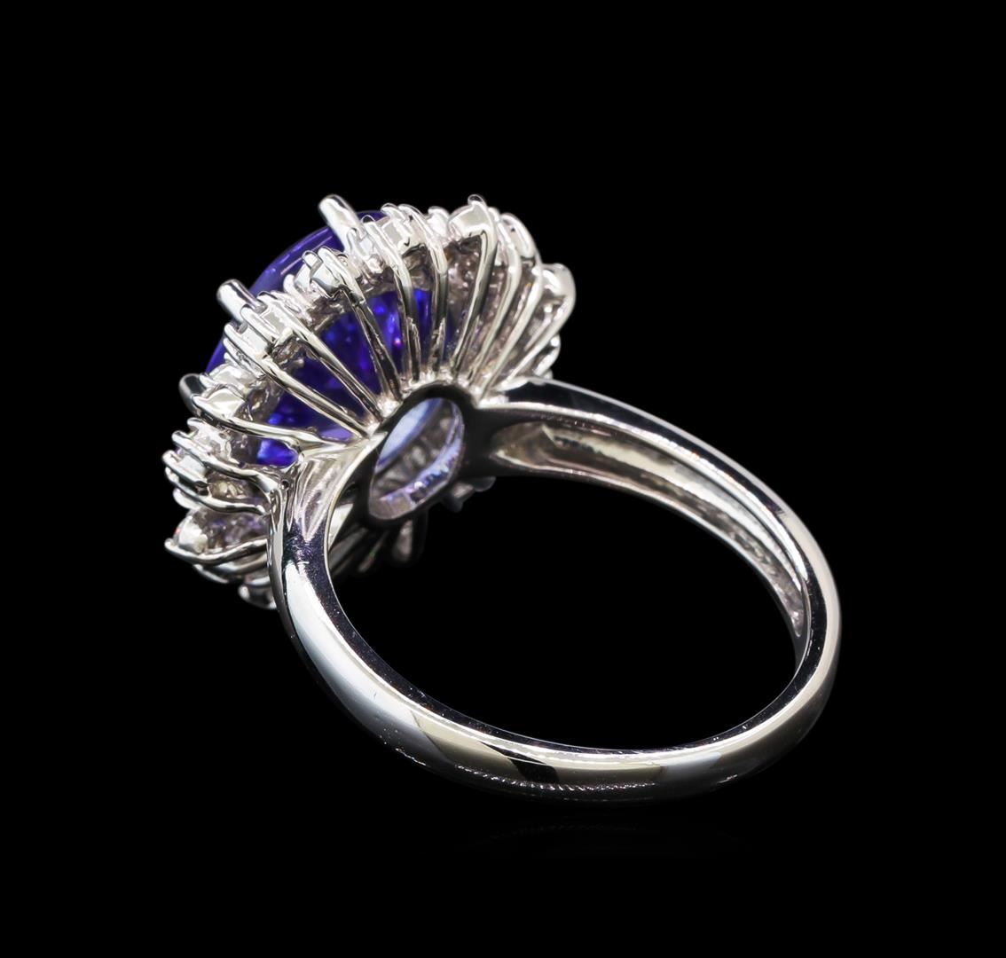 One electronically tested 14KT white gold ladies cast tanzanite and diamond ring with a bright polish finish. Identified with markings of "K14". Condition is new. Containing: One prong set oval modified brilliant cut natural tanzanite, measuring 11.90 x 9.50 x 6.18mm, approximate weight of 4.91ct., clarity is eye clean, type I, medium, very slightly grayish, violet color, (GIA V 5/3), cut is good. Twenty-Four prong set round brilliant cut diamonds, measuring 2.10 - 1.80 x 1.17mm (depth est.) approximate total weight of 24 Stones = 0.65ct. Clarity: SI-1 to SI-2. Color: I - J, Cut is Good. Colored gemstones are presumed to have been subjected to commonly used enhancement processes. All diamonds and colored gemstones are graded in the mounting, unless otherwise stated. Total Weight of Colored Stones 4.91ct. Total Weight of Diamonds 0.65ct. Total Weight of Ring 5.30 grams. GGL Appraised.