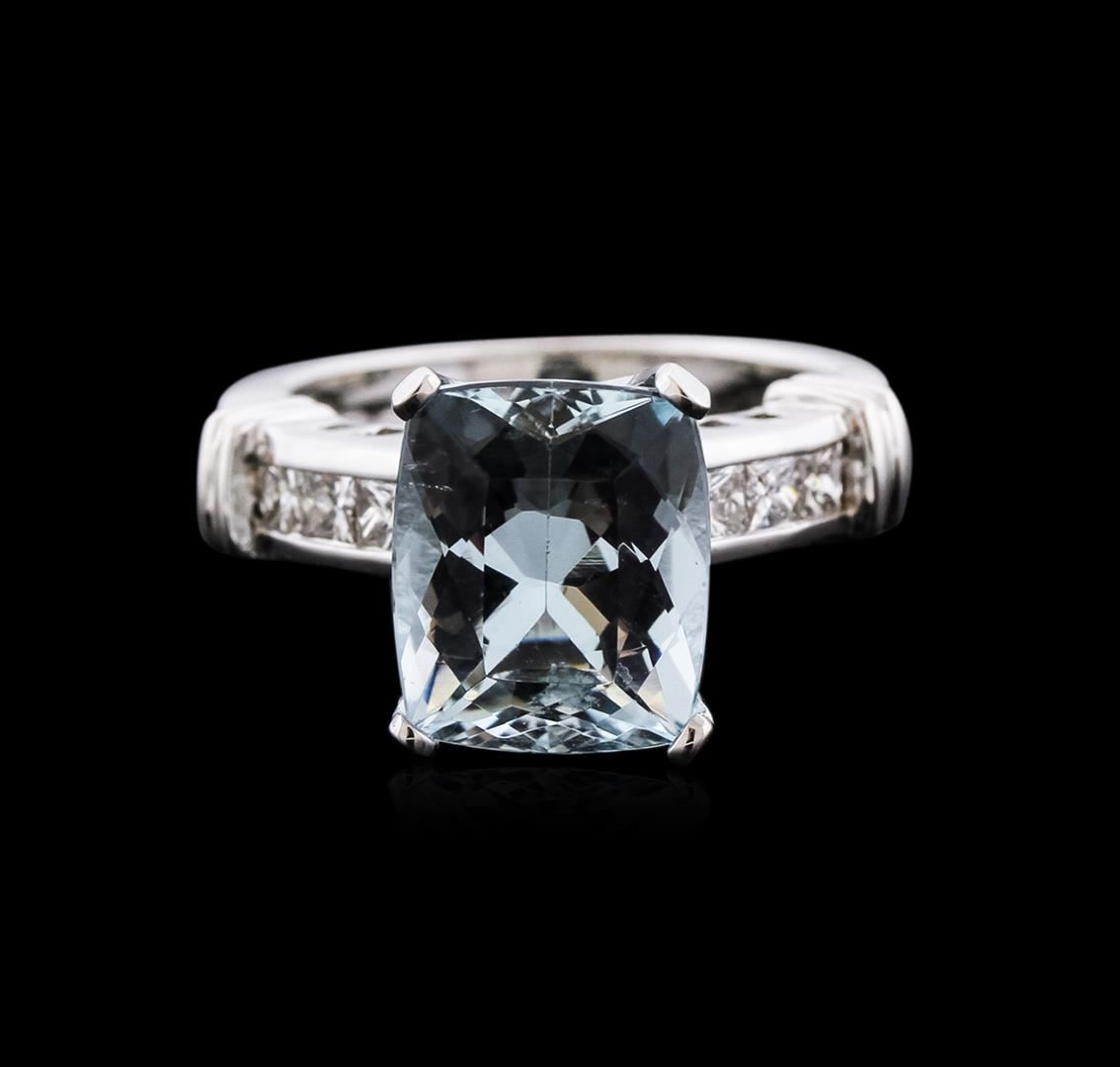 One ring featuring: 14KT white gold weighing 6.6 grams containing one radiant cut aquamarine center weighing 4.93ct and princess cut diamonds weighing a total of 0.50ct.
