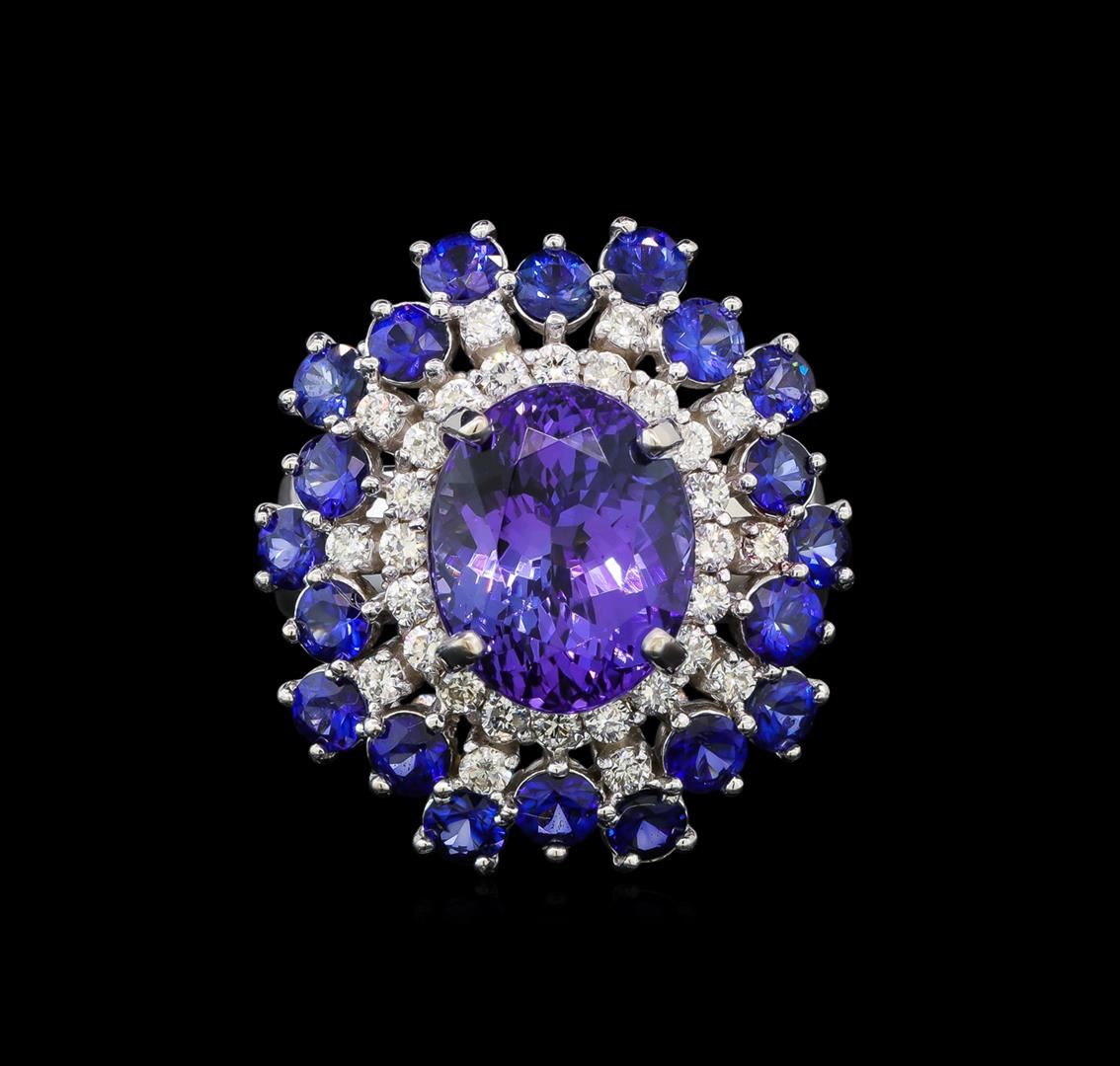 One electronically tested 14KT white gold ladies cast tanzanite, sapphire and diamond ring with a bright polish finish. Identified with markings of "K14". Condition is new. Containing: One prong set oval modified brilliant cut natural tanzanite, measuring 11.84 x 9.54 x 6.20mm, approximate weight of 4.93ct., clarity is eye clean, type I, light, very slightly grayish, violet color, (GIA V 3/3), cut is good. Twenty prong set round modified brilliant cut natural blue sapphires, measuring 3.00 - 2.50 x 1.79 mm, approximate. Total Weight of 2.60 ct., clarity is eye clean, type II, medium, moderately strong, blue color, (GIA B 5/4), cut is good. Thirty prong set round brilliant cut diamonds, measuring 1.60 - 1.50 x 0.93mm (depth est.) approximate. Total Weight of 30 Stones = 0.41ct. Clarity: SI-2 to I-1. Color: H - I, Cut is Good. Colored gemstones are presumed to have been subjected to commonly used enhancement processes. All diamonds and colored gemstones are graded in the mounting, unless otherwise stated. Total Weight of Colored Stones 7.53ct. Total Weight of Diamonds 0.41ct. Total Weight of Ring 12.30 grams. GGL Appraised.
